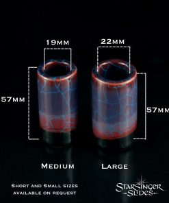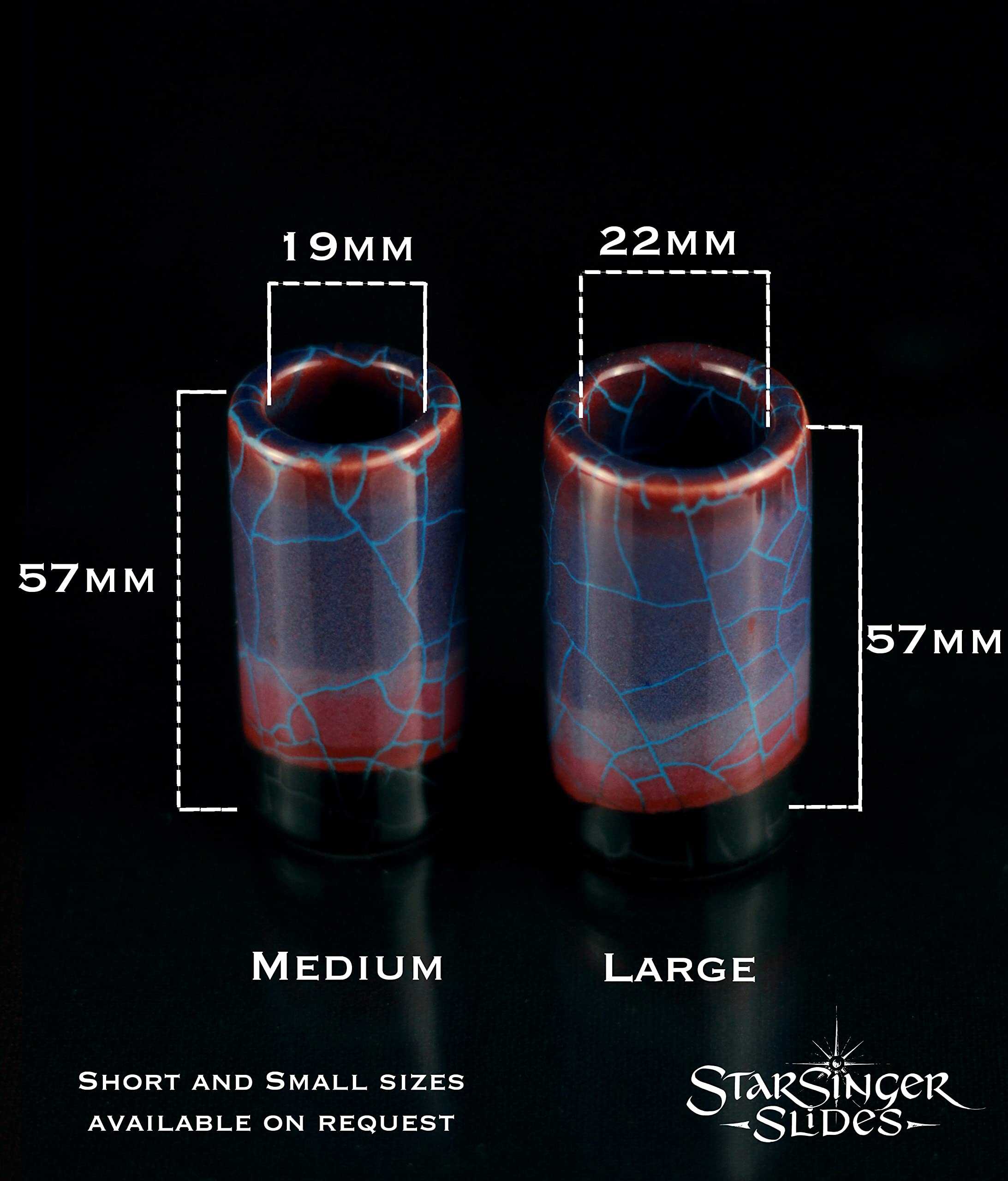Hecho a mano en piedra artificial. Triple cocido a más de 1200°C. Extruido, no fundido, por lo que es mucho más resistente que la mayoría de las otras diapositivas de cerámica y vidrio. CONSEJO DE TAMAÑO Puedes tocar la diapositiva en cualquier dedo, pero normalmente se toca en el dedo anular o el meñique. Si estás pensando en comprar como regalo, la talla mediana es una opción segura, ya que, si es demasiado pequeña para el dedo anular, debería ajustarse al meñique. Debido a la naturaleza del esmaltado de arcilla, tengo que dejar el lado inferior de la diapositiva sin esmaltar. Debido a que cada diapositiva está hecha a mano, espera una variación muy ligeramente en tamaño, color y densidad de línea.