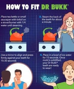 Los dientes Dr Bukk son los originales Dientes Falsos Estilo Hollywood hechos a mano en EE. UU. desde 1986. Ajuste personalizado en casa con nuestras Instrucciones de Hágalo Usted Mismo. Creemos que la risa es la mejor medicina, y nuestra misión es difundir alegría y diversión una sonrisa a la vez.