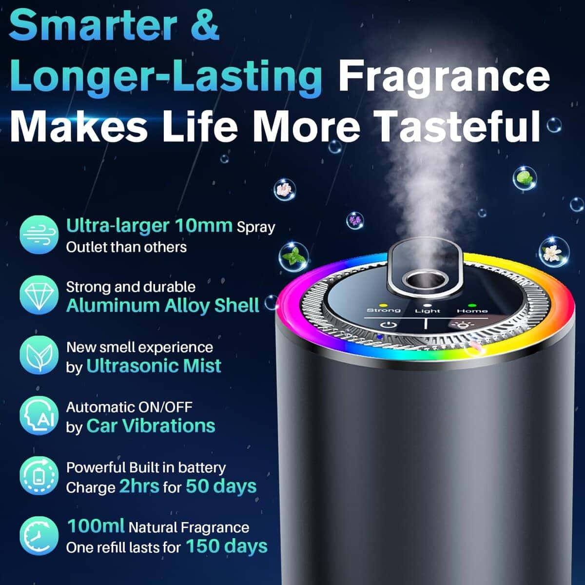 Experimenta una experiencia premium de aroma para automóvil con el Difusor de Aroma para Automóvil Inteligente con Proyección de Cielo Estrellado. Disfruta de fragancias duraderas durante 6 meses con nuestras exclusivas mezclas de aceites esenciales sin alcohol y no tóxicos. La tecnología de difusor ultrasónico de 8 mm neutraliza activamente los olores en lugar de simplemente enmascararlos, creando una fresca niebla visible en todo tu vehículo. Transforma tu automóvil con proyecciones de estrellas brillantes y luces RGB dinámicas sincronizadas con la música, creando la atmósfera perfecta para los viajes nocturnos. El difusor de aroma para automóvil se ajusta automáticamente al ritmo de tu música, proporcionando una experiencia sensorial única. Personaliza la intensidad del aroma con 3 modos ajustables: Suave, Fuerte y Turbo, ideal para un uso diario sutil o para eliminar olores intensos. El inteligente encendido/apagado del difusor de aroma se activa al encender el motor y se detiene al estacionar, garantizando un aroma constante sin desgaste de batería ni desperdicio de aceite entre los viajes. Con garantía de 1 año y soporte en EE. UU., este sistema de aroma para automóvil ofrece un servicio premium y la tranquilidad de una compra satisfactoria.