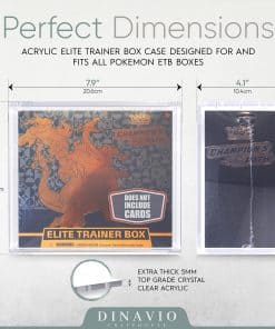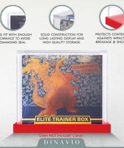 Protege tus tesoros del Elite Trainer Box de polvo, suciedad, rayos UV y daños accidentales con esta caja de exhibición de acrílico de primera calidad. Fabricada con acrílico ultra grueso recientemente actualizado de 7 mm + 5 mm y equipada con cuatro imanes de 5×3 mm, esta caja proporciona una protección incomparable y muestra una pantalla impresionante. Además, incluye una sólida base de acrílico rojo para una estabilidad adicional y un aspecto elegante. Las dimensiones internas están diseñadas para adaptarse a las cajas de refuerzo Modern English y ofrecen una visibilidad cristalina para exhibir tus Elite Trainer Boxes con claridad y elegancia.