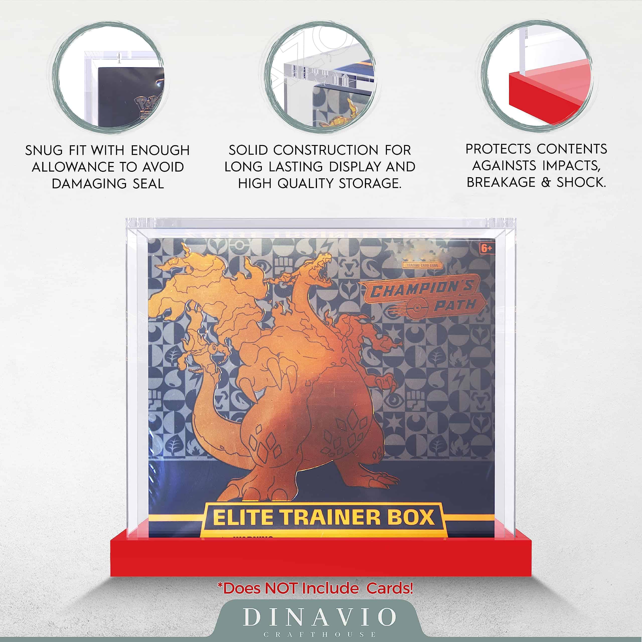 1. Protección incomparable. Protege tus tesoros de Elite Trainer Box del polvo, la suciedad, los rayos UV y los daños accidentales. Nuestra resistente caja de acrílico actúa como barrera protectora, asegurando que tu colección permanezca en condiciones inmaculadas durante años. 2. Artesanía inigualable. Acrílico ultra grueso recientemente actualizado de 7 mm + 5 mm cargado con cuatro imanes de 5×3 mm, creando un entorno extremadamente fuerte y protector que muestra una pantalla verdaderamente impresionante. 3. Un pequeño extra para ti. Incluimos una base sólida de acrílico rojo con tu compra, agregando un nivel adicional de solidez y una apariencia nítida a tu propia exhibición personalizada. Combinado con una tapa magnética abatible para un acceso práctico desde la parte superior.
