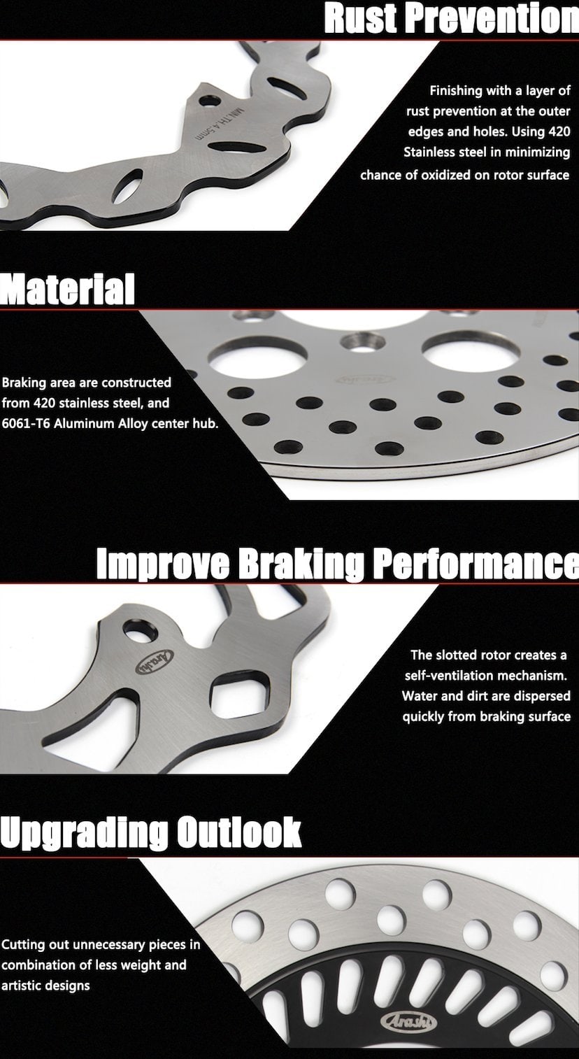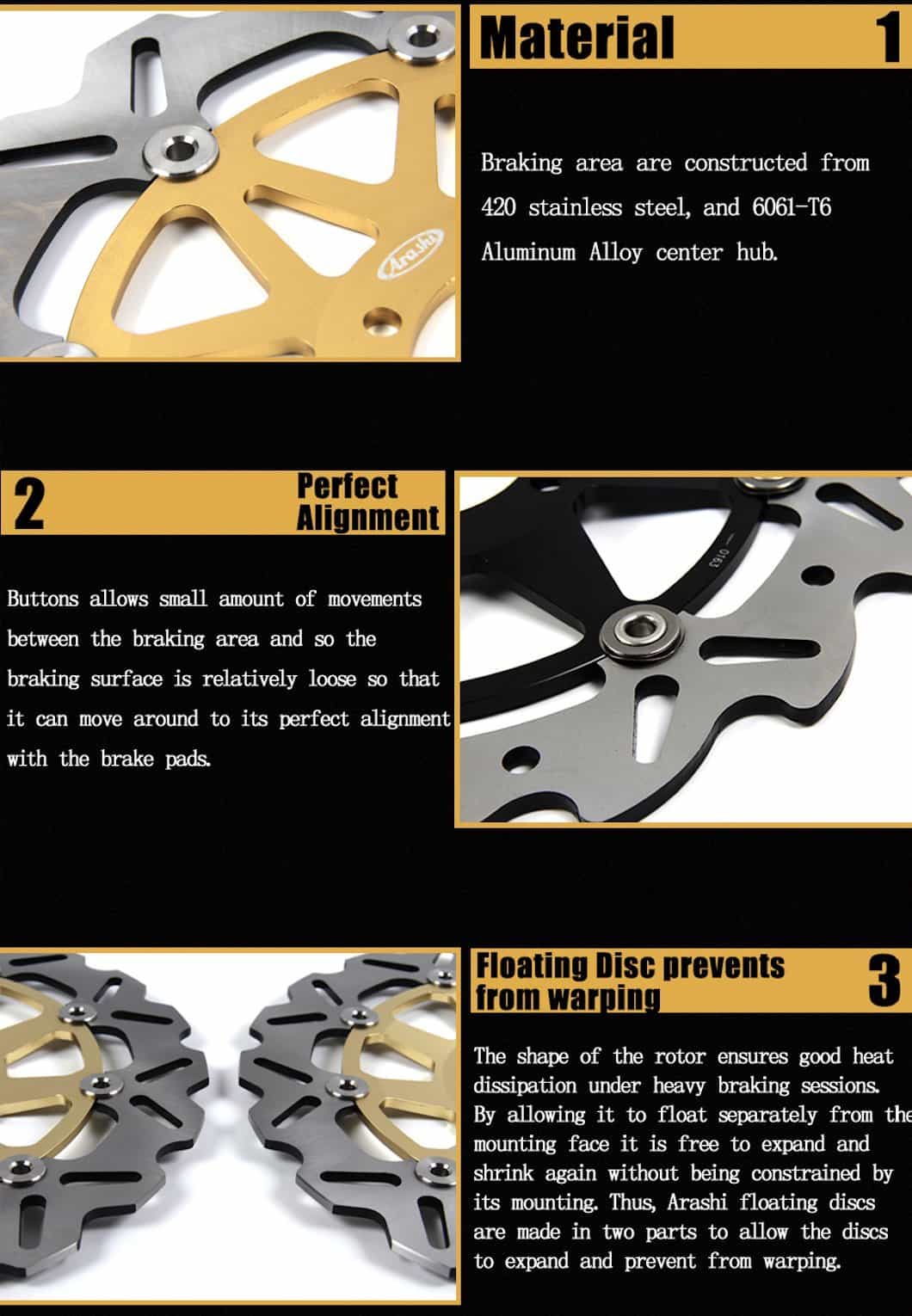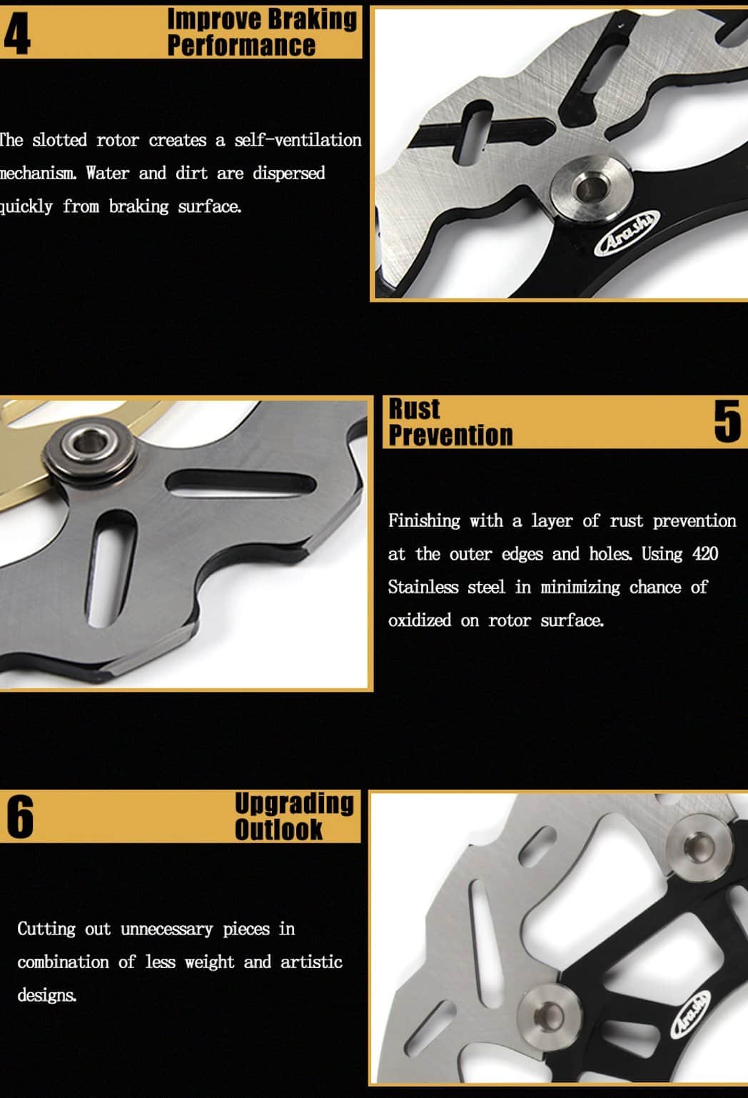 ¡Bienvenido a la tienda oficial de Arashi! Compra en bundle para ahorrar más. Características: – Los discos de freno Arashi están construidos con acero inoxidable 420, con aleación de aluminio CNC 6061-T6 en el centro para un menor peso. – La forma del disco asegura una buena disipación del calor en sesiones de frenado intenso. – Reducción del desvanecimiento del freno, minimizando el pandeo y garantizando la longevidad del rotor. – El rotor ranurado asegura que el agua y la suciedad se dispersen rápidamente al frenar. Especificaciones Discos de Freno: – Delanteros, Diámetro: 300mm, Puntos de montaje: 5, Flotante: Sí, Color: Dorado – Traseros, Diámetro: 220mm, Puntos de montaje: 5, Flotante: No (Fijo), Opciones de diseño: Onda. Compatibilidad: Para SUZUKI GSXR 600 2004-2005, Para SUZUKI GSXR 750 2004-2005, Para SUZUKI GSXR 1000 2003-2004