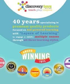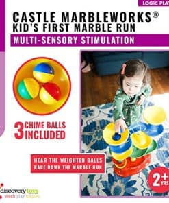 ¡Tu hijo se divertirá dejando caer las 3 bolas de campana ponderadas por la pista de este sistema de construcción de canicas! Mientras las bolas corren, giran y zigzaguean, tu pequeño aprende a predecir el curso de las bolas. Incluye 8 piezas. Las partes no son compatibles con Marbleworks. 25″ x 14 1/2″ x 10″ (63 cm x 37 cm x 25 cm). Acerca de Discovery Toys: Mejores productos, mejor crianza. Discovery Toys, una marca de confianza durante más de 35 años, se especializa en productos de aprendizaje de calidad premium impulsados por niños para recién nacidos hasta niños en edad escolar. La compañía comenzó cuando una educadora de la primera infancia reunió a un grupo de maestros dedicados, madres y padres para abordar el importante tema de la educación para niños a través del juego. El mejor en su clase, Discovery Toys combina múltiples niveles de aprendizaje en cada juguete con estándares de seguridad y calidad más allá de los estándares nacionales. El producto de Discovery Toys no es un juguete educativo típico que puedas encontrar en tu tienda de juguetes local. Cada producto de Discovery Toys incorpora múltiples capas de aprendizaje para 1) involucrar los múltiples sentidos de un niño y los tres estilos de aprendizaje y 2) potenciar al niño para crecer y avanzar con el producto. Trabajamos cuidadosamente con nuestros socios de diseño y fabricación para incorporar una experiencia de juego única en cada uno de nuestros productos, una experiencia que estimula múltiples centros en el cerebro simultáneamente, una experiencia que promueve tanto el pensamiento crítico COMO el juego imaginativo abierto. NUESTRA MISIÓN Enseñar. Discovery Toys crea juguetes de aprendizaje altamente atractivos, libros, juegos y música que ayudan a los padres y a otros a enseñar habilidades de aprendizaje a través del juego. Jugar. Discovery Toys enciende la imaginación y el interés de los niños mientras aprenden y crecen a través del juego cada día. Inspirar. ¡Discovery Toys inspira el aprendizaje! Nuestros productos no solo inspiran a los niños a aprender, inspiran a los padres y educadores a enseñar y aprender.