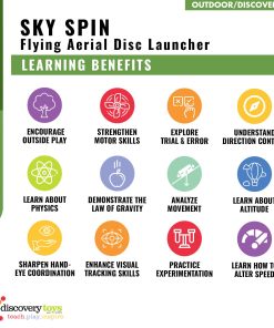 Beneficios: Mantiene a los niños comprometidos y jugando al aire libre. Fortalece habilidades motoras finas y gruesas. Fomenta la experimentación y el ensayo y error: Varíe la fuerza de su tirón para ajustar la altura a la que vuela el ala. Varíe la inclinación del lanzador para ajustar la dirección del vuelo. Aprenda sobre aerodinámica y física básica. Afilia la coordinación mano-ojo mientras intenta atrapar el ala.