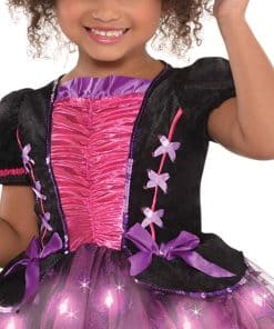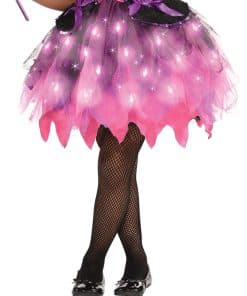 ¡Deja que tu pequeña brille con nuestro disfraz de bruja brillante con luces para niñas! Con un vestido rosa, morado y negro con una falda de tutú, este disfraz de bruja es mágicamente femenino. Luces ocultas brillan desde debajo de capas de tul rosa y morado y la batería oculta mantiene el misterio mágico. Mangas abullonadas y un corsé con cordones complementan el sombrero de bruja puntiagudo. Completa su disfraz de bruja brillante con la varita morada y ¡estará lista para un tiempo de juego encantado!