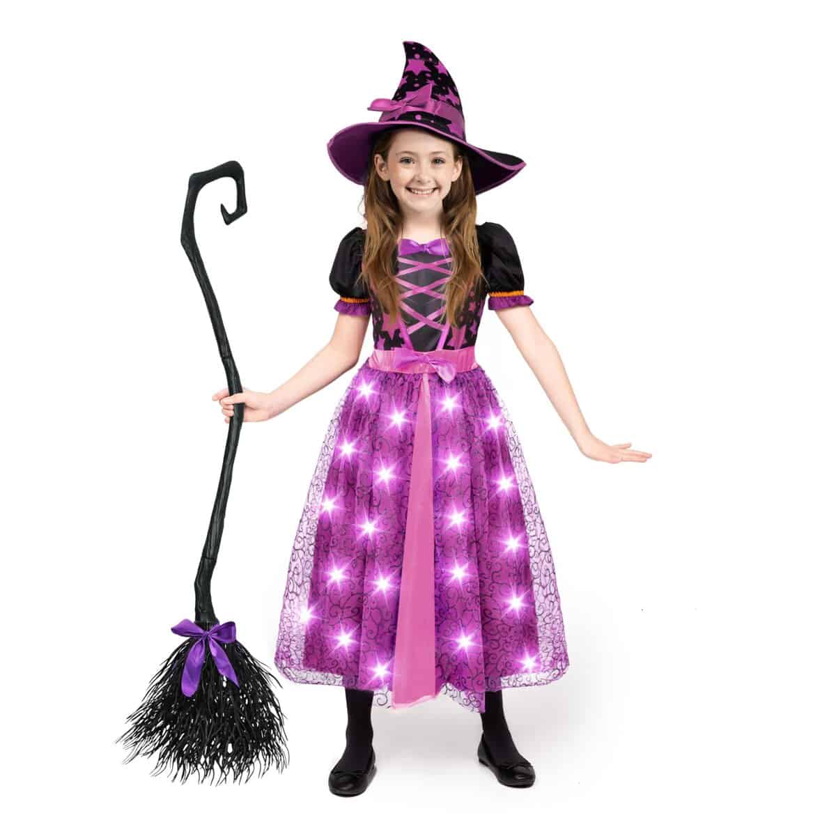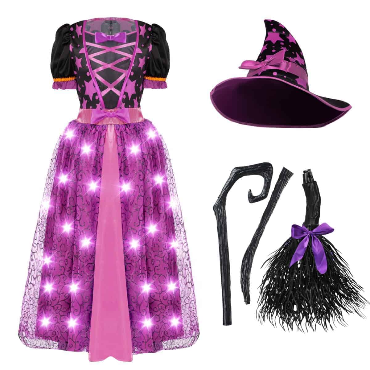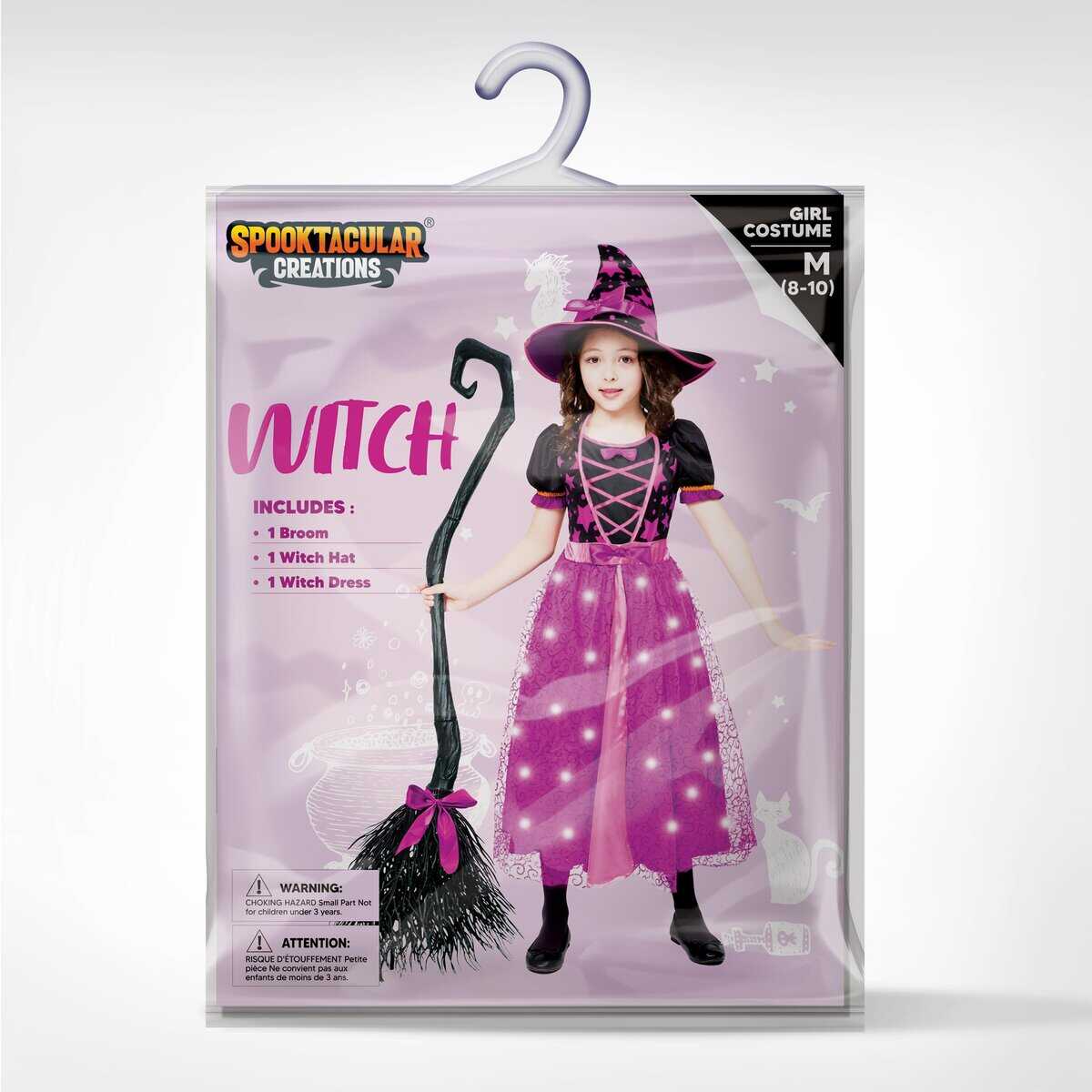 Disfraz de Bruja Espeluznante para Niñas, Disfraz de Bruja con Luces Rosas, Disfraz de Bruja de Cuento de Hadas para Halloween. ¡Paquete súper valor: este conjunto de disfraz de bruja con luces rosas incluye 1 vestido rosa con luces LED (baterías incluidas), 1 sombrero y 1 escoba, convirtiéndola en el centro de atención donde quiera que vaya. Abrace la magia de Halloween con nuestro conjunto de disfraz de bruja con luces. Calidad: Confeccionado en 100% poliéster, este vestido de bruja es suave, cómodo y aprobado en pruebas de seguridad, brindándole tranquilidad en cuanto a su calidad y cumplimiento de normas de seguridad. Ocasiones Especiales: Ideal para el Halloween, fiestas de disfraces de Halloween, eventos nocturnos de Halloween, fiestas de cosplay, fiestas temáticas, actuaciones en el escenario, este disfraz de bruja rosa seguramente será un éxito. Deje que su hijo se sumerja en un mundo de cuento de hadas de magia y travesuras mientras se transforma en una bruja encantadora y malvada. Instrucciones de Cuidado: Para mantener su atuendo limpio y fresco, recomendamos limpiar el disfraz con una esponja y llevarlo a la tintorería para el mantenimiento. Evite lavarlo con agua, usar lejía, secarlo en secadora o plancharlo. Ajuste Perfecto: Nuestro disfraz de bruja de cuento de hadas está diseñado para niñas y disponible en 4 tallas: Toddler (3-4 años), Small (5-7 años), Medium (8-10 años), Large (10-12 años), lo que es adecuado para niños de diferentes edades y garantiza un gran ajuste.