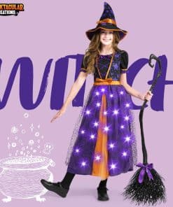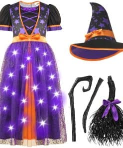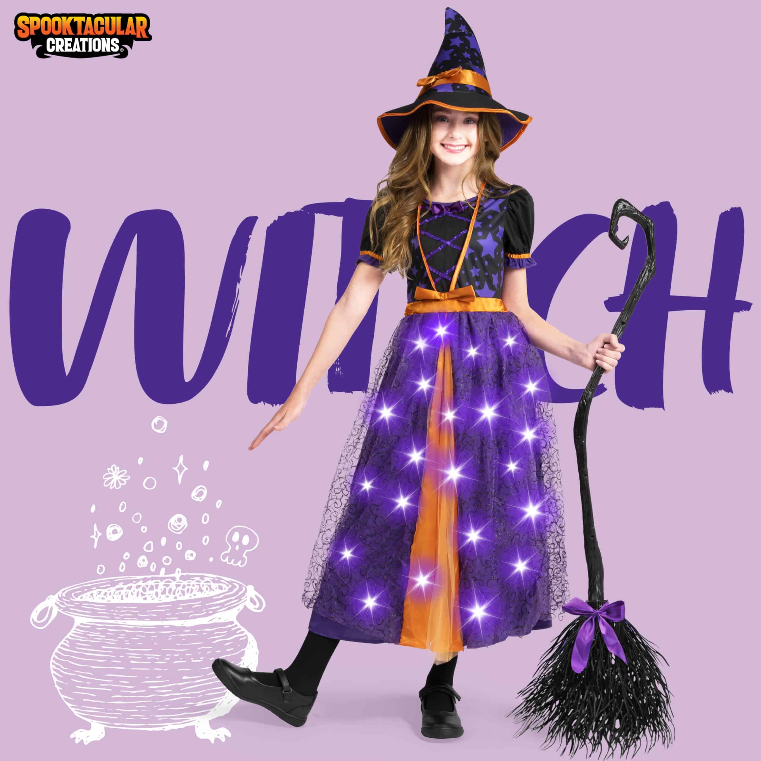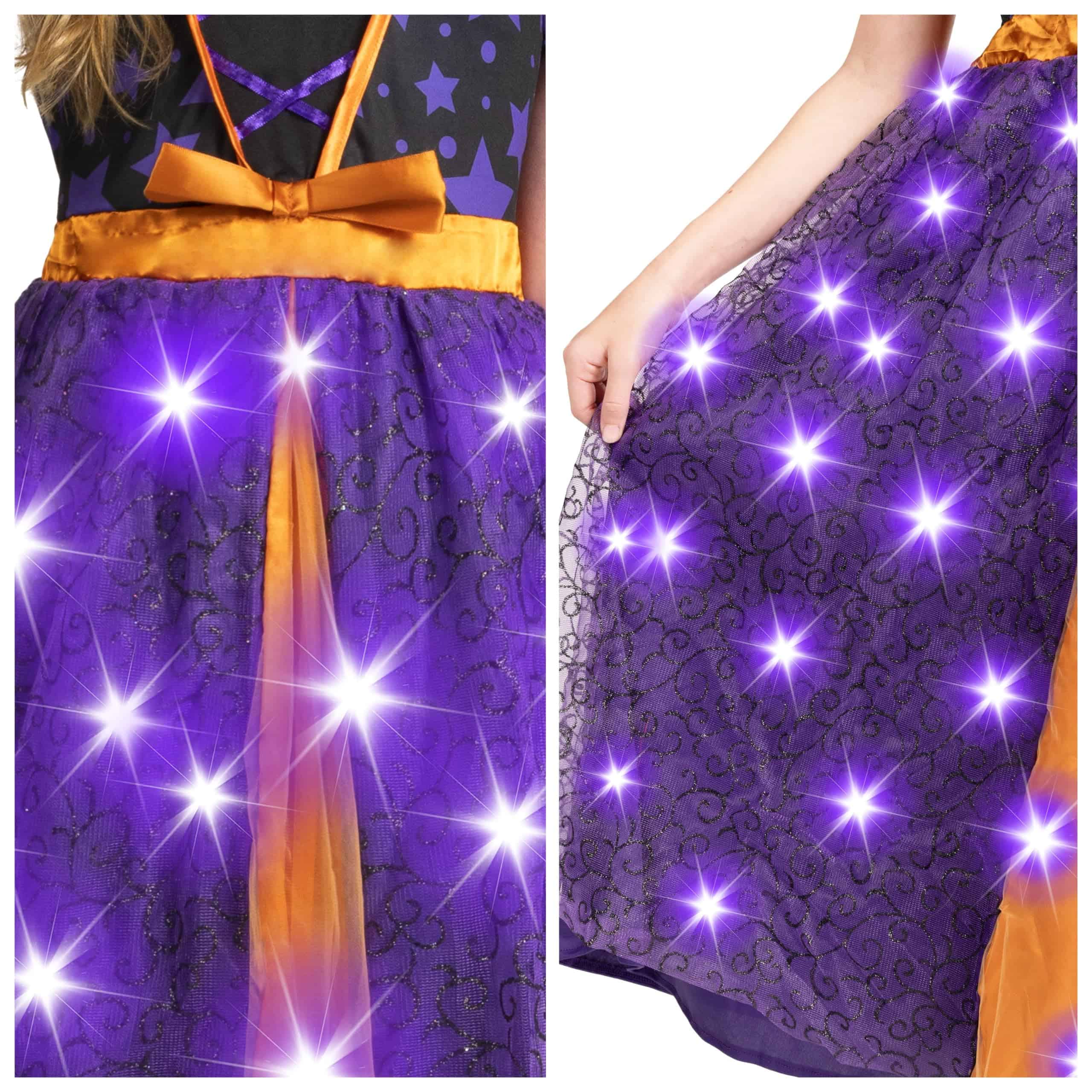 Disfraz de Bruja Morada con Luces para Niñas Deluxe. Incluye Sombrero a Juego de la Bruja, un vestido de falda amplia con luces LED y una escoba.