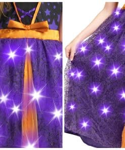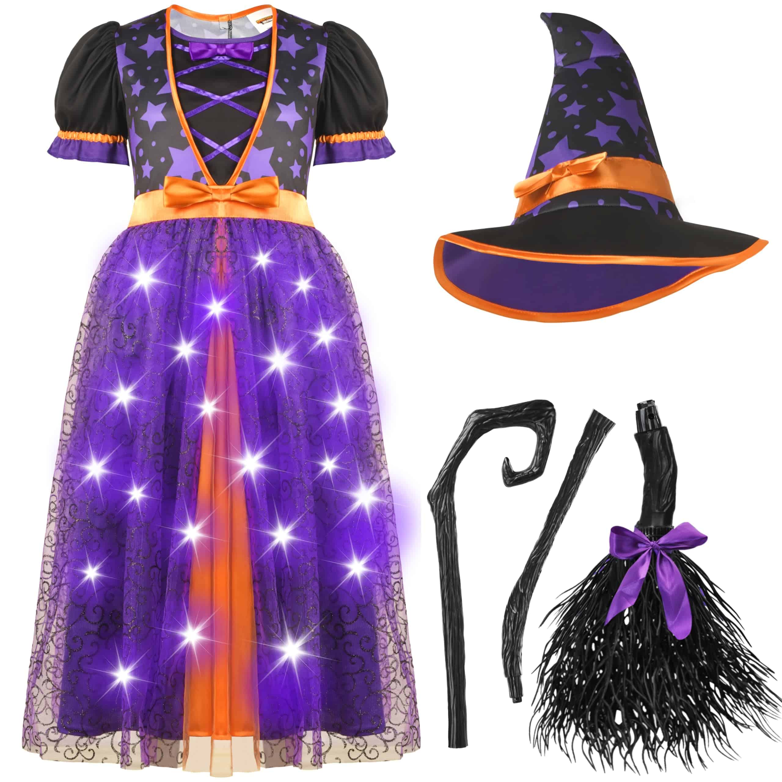 Disfraz de Bruja Morada con Luces para Niñas para Edades de 3-10 años, Disfraz de Bruja de Cuento de Hadas para Niñas para Halloween, Disfraz de Cuento de Hadas, Fiestas Glow Up