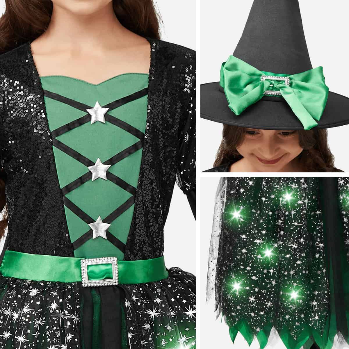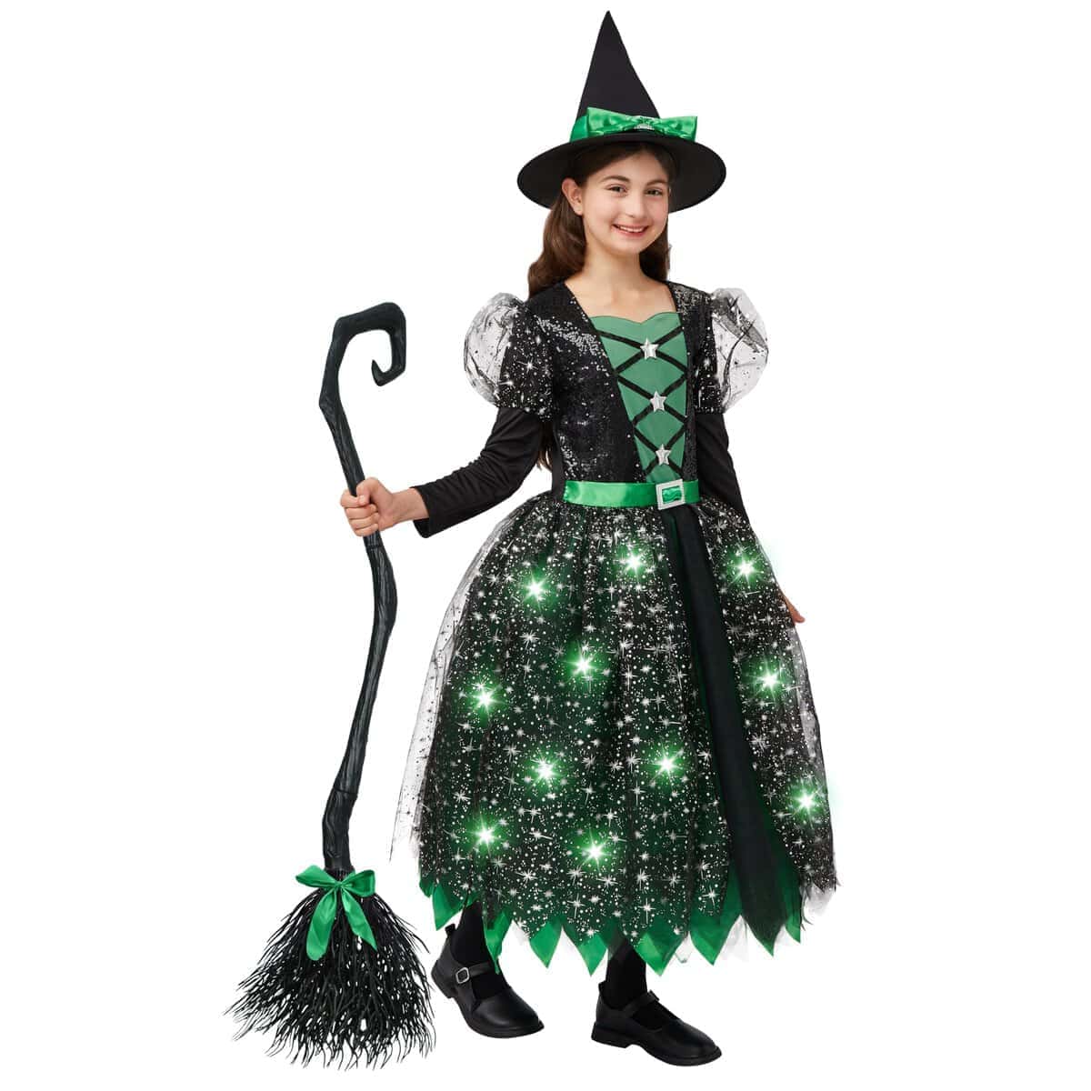 Disfraz de Bruja con Luces LED de Spooktacular Creations para Niñas, Disfraz de Bruja Verde con Sombrero y Escoba, Disfraz de Bruja Dulce con Diseños Fantásticos