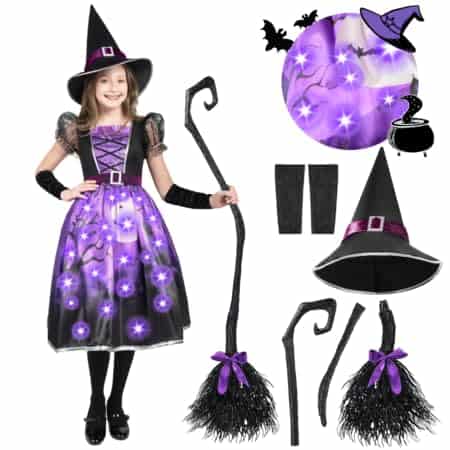 Super Value Pack: Este set de disfraz de bruja impreso morado con luces incluye 1 vestido morado con luces LED (pilas incluidas), un sombrero, una escoba, 1 par de mangas y 1 cinturón, convirtiéndola en el centro de atención donde sea que vaya. Aprovechemos la magia de Halloween con nuestro set de disfraz de bruja iluminado