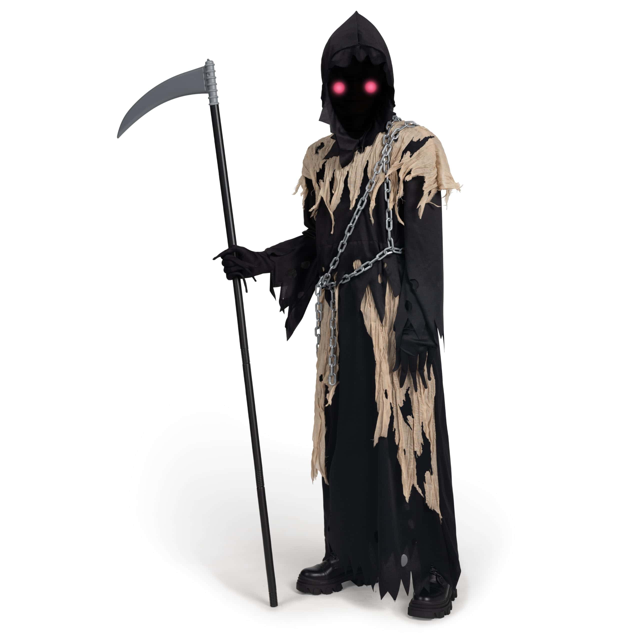 Disfraz de Espeluznante Creaciones para Niños Grim Reaper, Disfraz de Grim Reaper con Ojos Brillantes para Niños, Disfraz de Calavera Grim Reaper Negro para Halloween