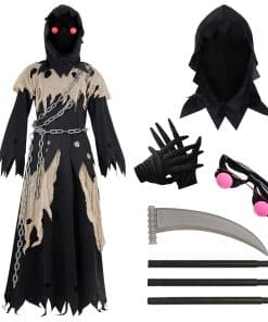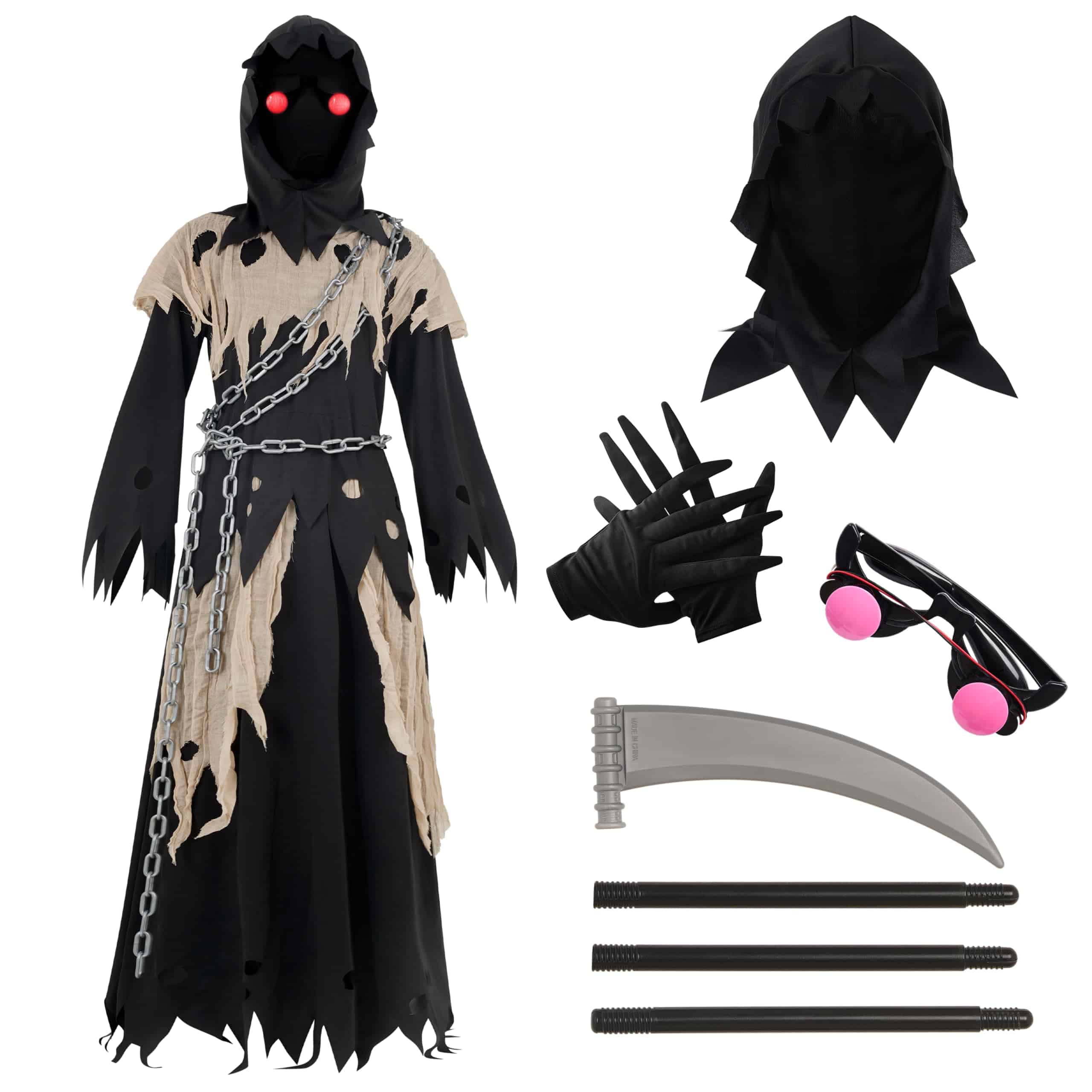 Súper Paquete de Valor: Este conjunto de disfraz de grim reaper incluye 1 túnica negra, 1 máscara con capucha, 1 guadaña de juguete, 1 cadena de plástico, 1 par de guantes y 1 par de gafas luminosas (baterías incluidas), creando un tenebroso y cautivador disfraz de calavera grim reaper para niños