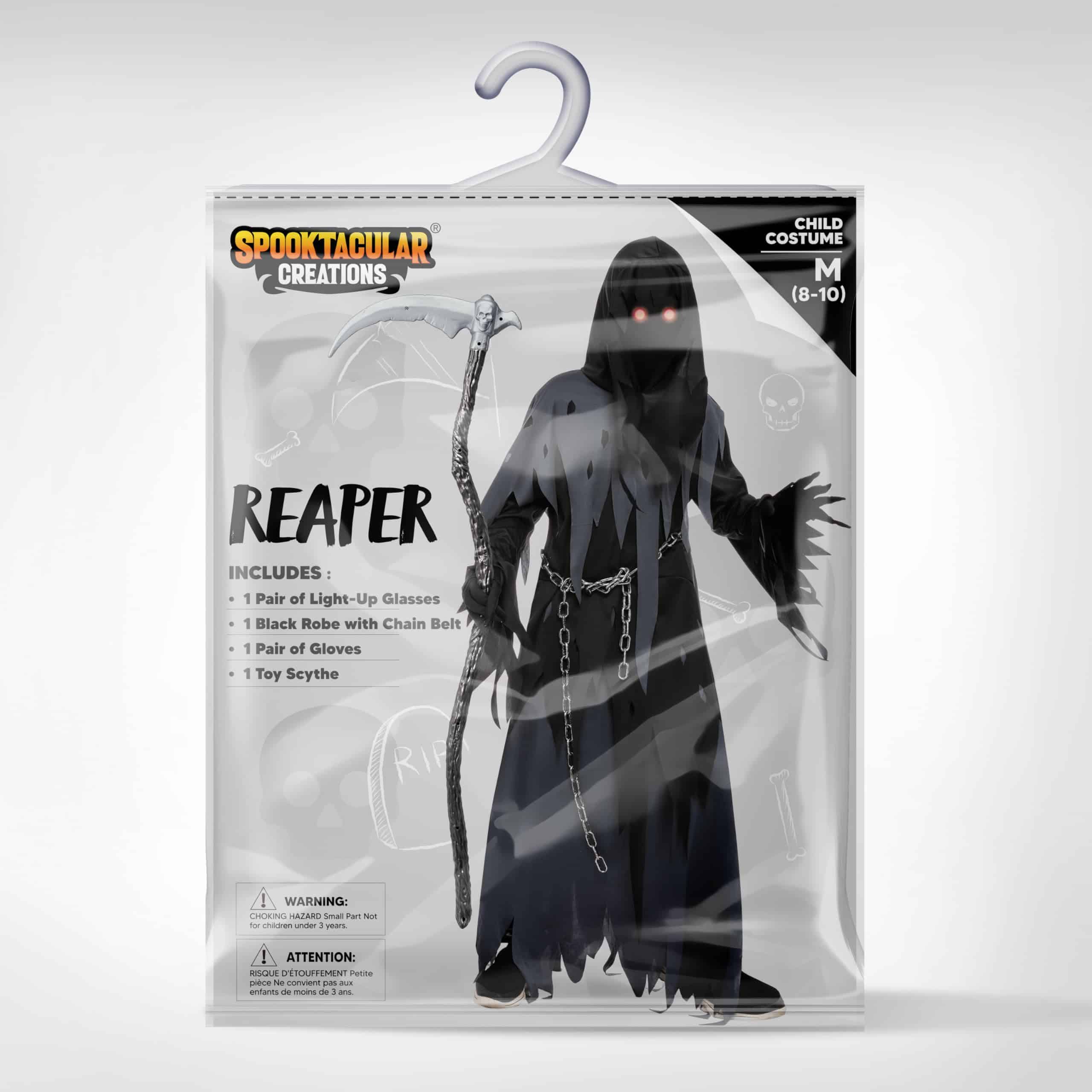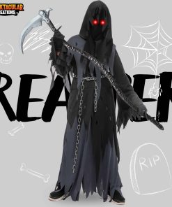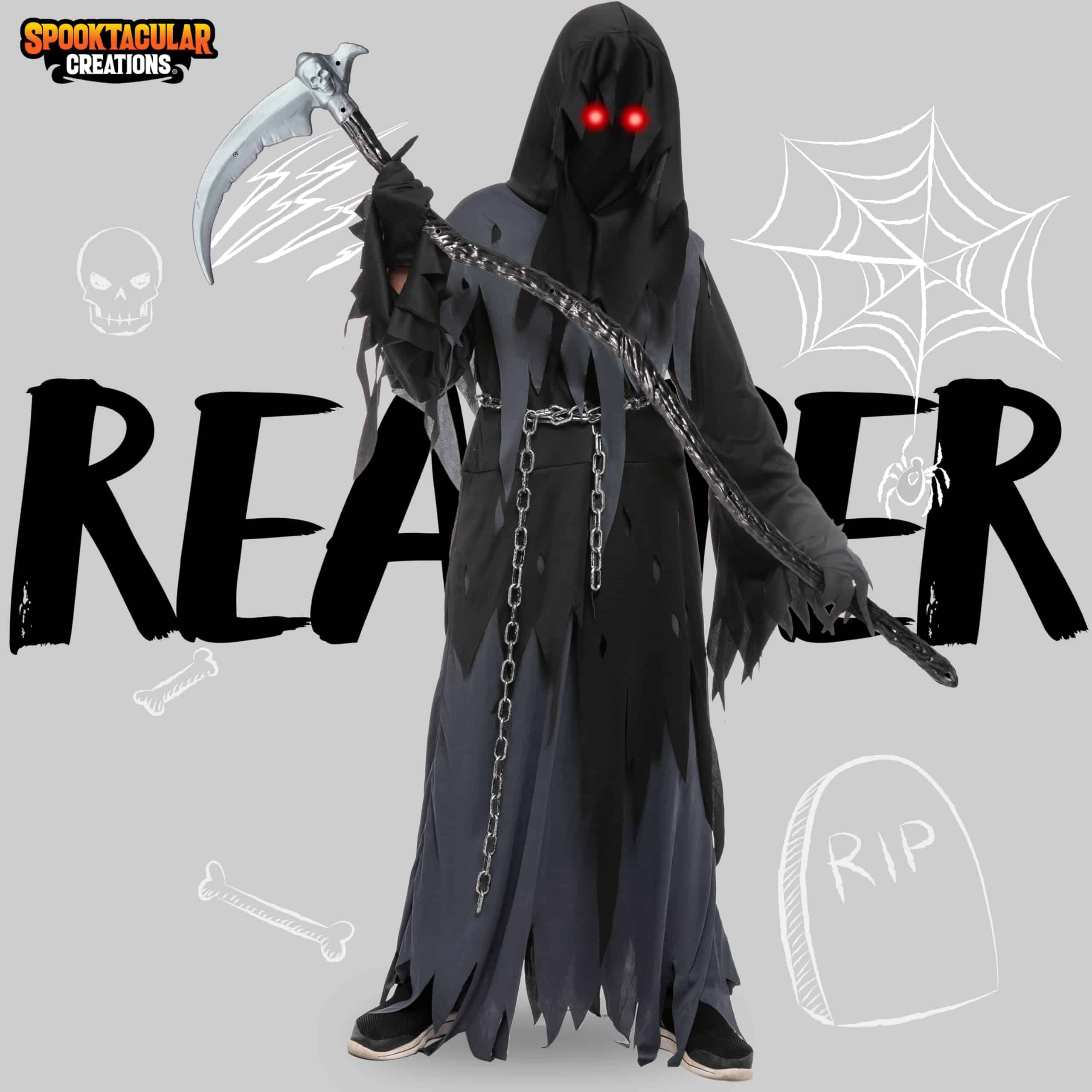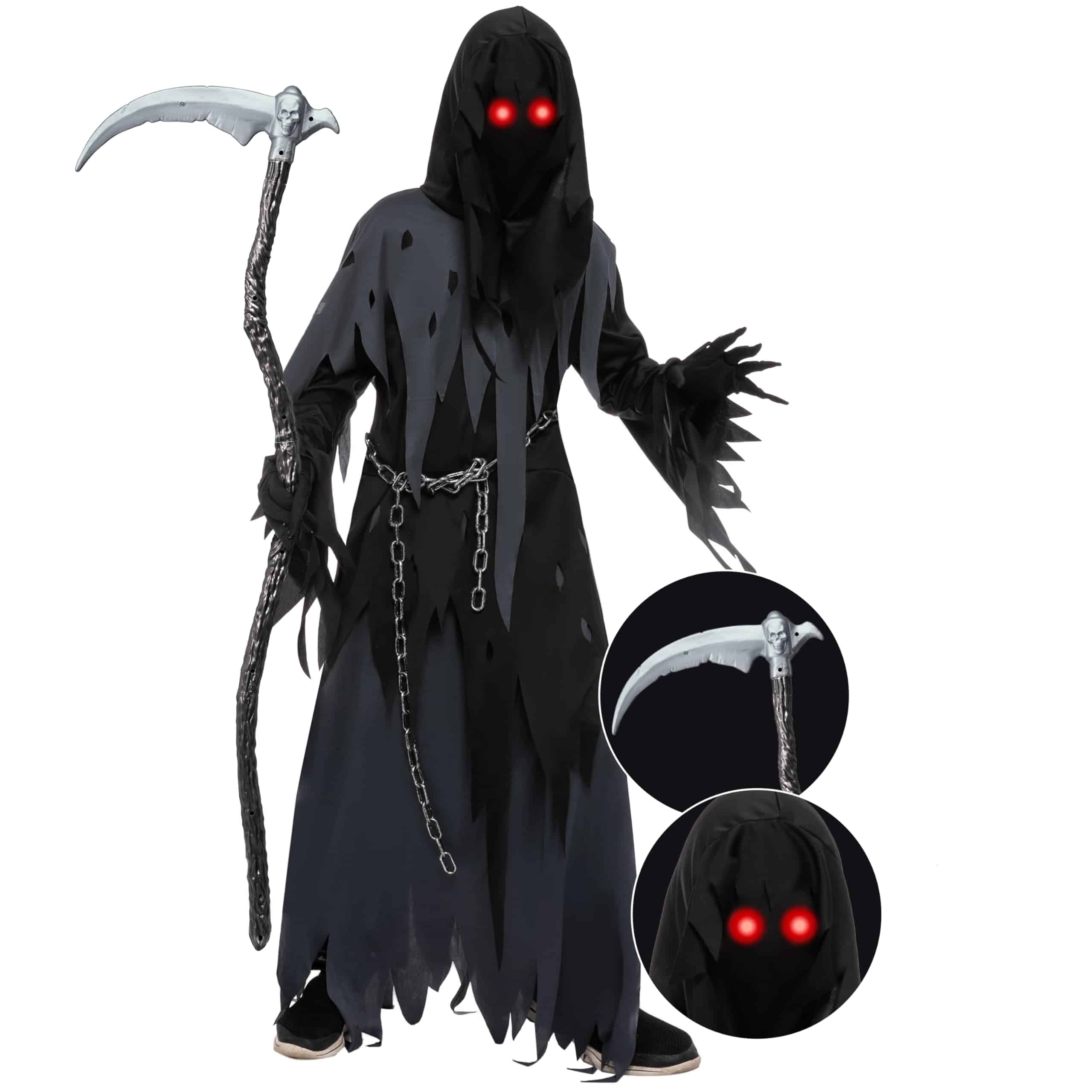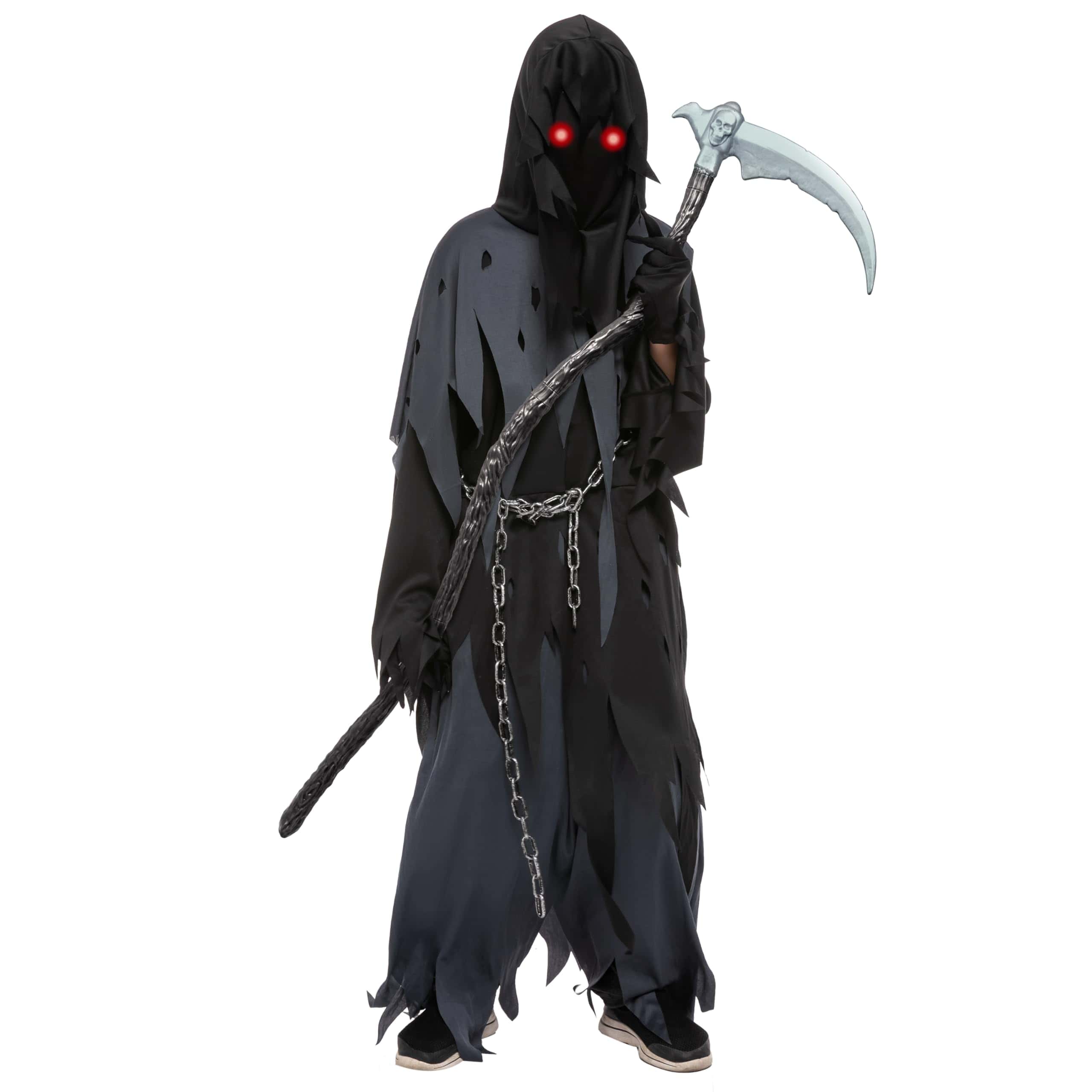 DISFRAZ DE GRIM REAPER PARA NIÑOS. Nuestro Disfraz de Niño Reaper incluye 1 Vestido, 1 capa con capucha, 1 Cadena de metal, 1 par de guantes negros, 1 Máscara facial, 1 guadaña de juguete, 1 Par de ojos iluminados