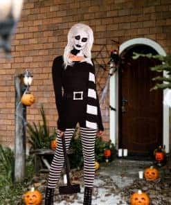 Puedes hacer un viaje retorcido por la madriguera del conejo en el Disfraz de Alicia la Psicópata que presenta un mono de una sola pieza con mallas a rayas adjuntas y un cinturón con una hebilla de metal falsa y las mangas se extienden más allá de la muñeca con agujeros para los pulgares. Completa tu aspecto siniestro con una peluca blanca de plumas de hombro de longitud y una bufanda a rayas negra y blanca. Este conjunto de disfraz es ideal para Halloween, fiestas de disfraces, juegos de vestir y cualquier otra ocasión.
