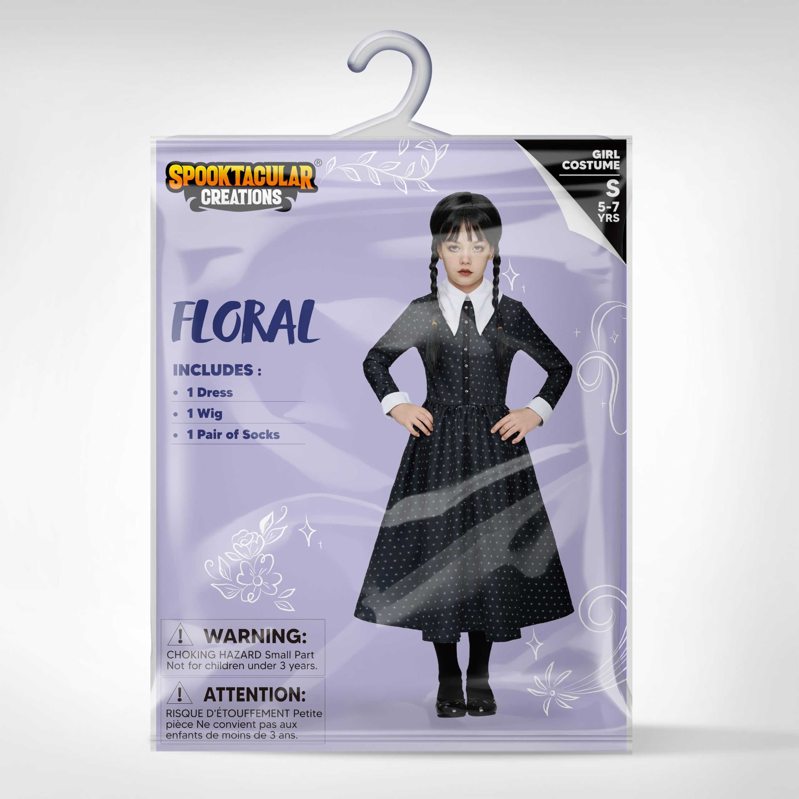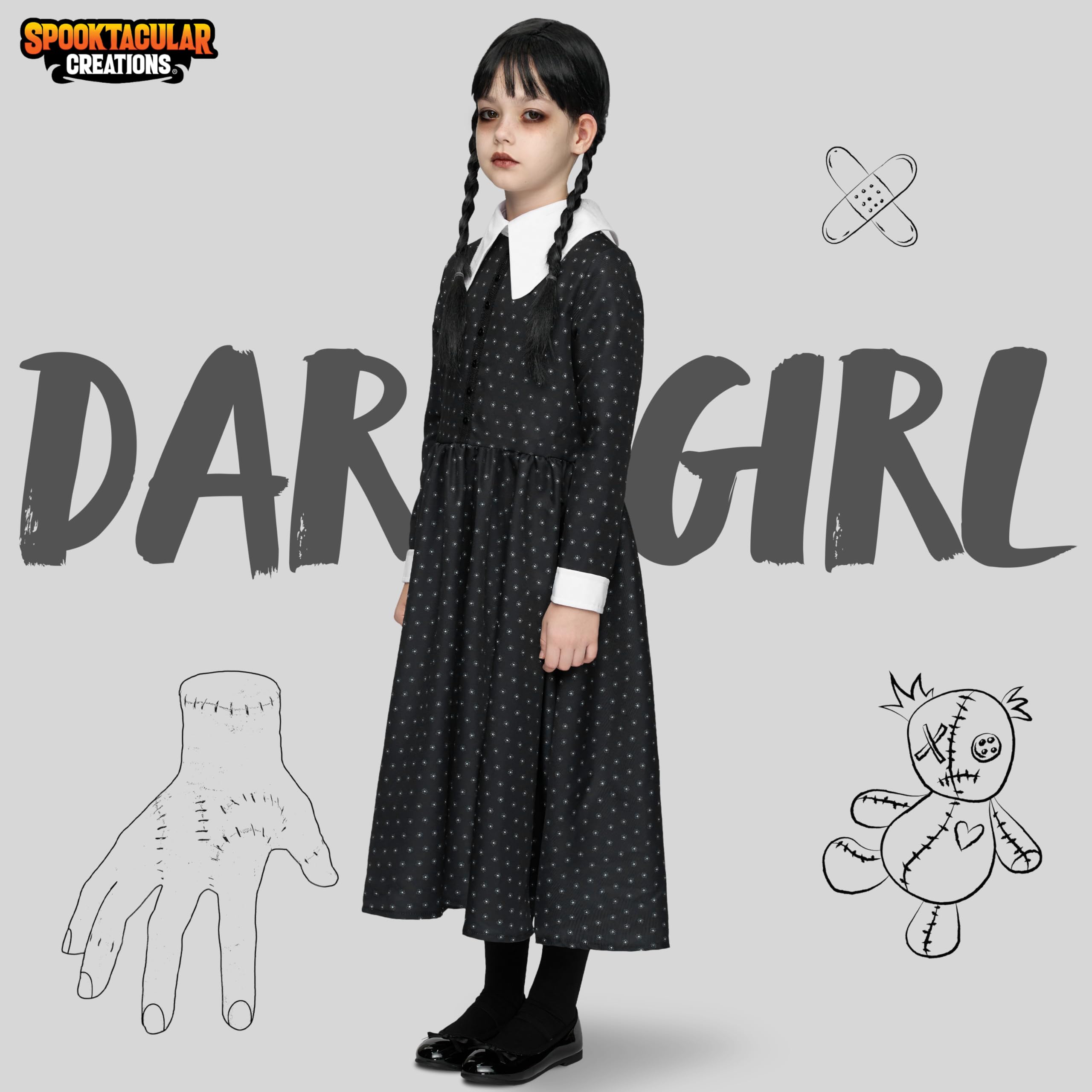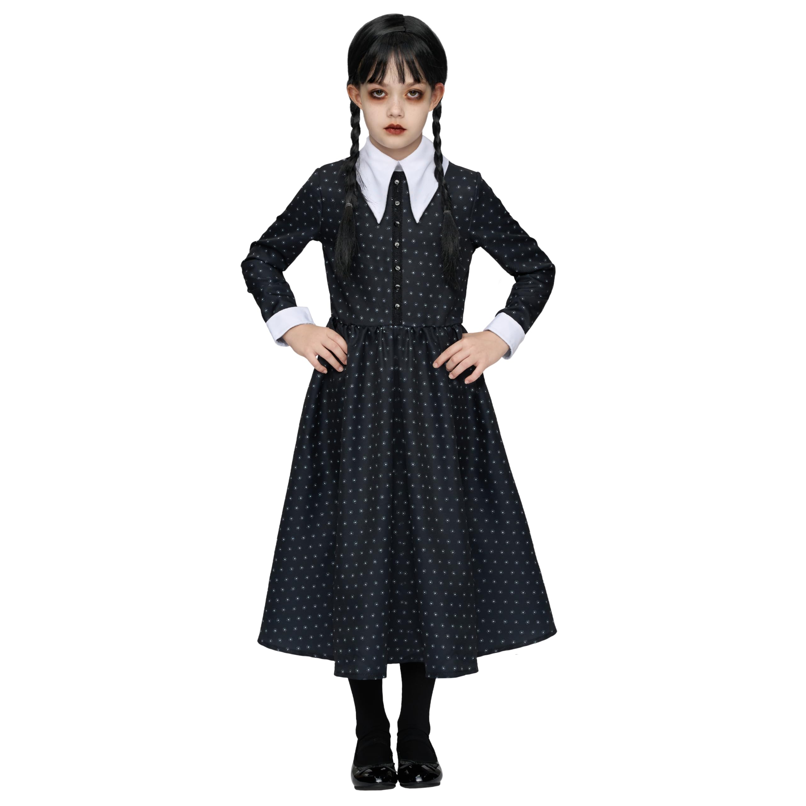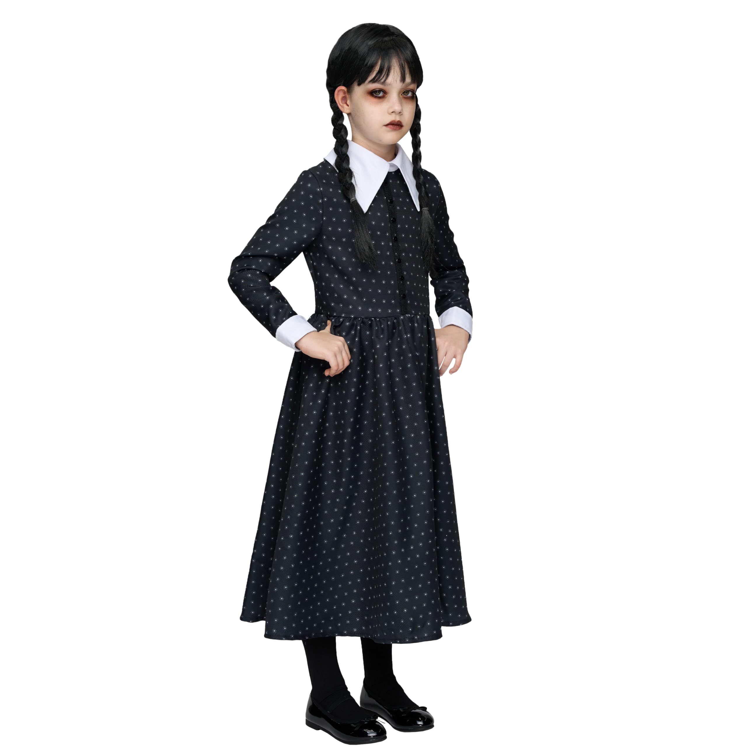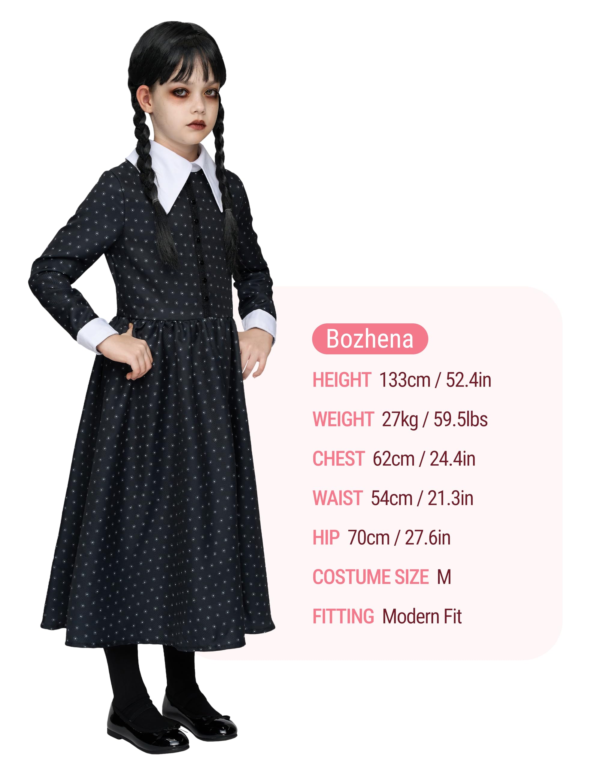 Fabricado en 100% poliéster, este vestido negro de manga larga es suave, cómodo y aprobado en pruebas de seguridad, brindándote tranquilidad en cuanto a su calidad y cumplimiento de los estándares de seguridad. Ideal para disfraces de Halloween, fiestas de disfraces, eventos de cosplay, fiestas temáticas, actuaciones en el escenario, juegos de roles, reuniones informales, fiestas temáticas de personajes de películas y otros eventos temáticos conocidos. Fácil de limpiar, simplemente limpiar con una esponja para mantenerlo en óptimas condiciones. Evitar secar en secadora y planchar para preservar la tela y el diseño. Diseñado para adaptarse a la mayoría de los tipos de cuerpo de niñas y disponible en tres tallas (Pequeño (5-7 años), Mediano (8-10 años) y Grande (10-12 años)). Consulta la tabla de tallas para un ajuste perfecto.
