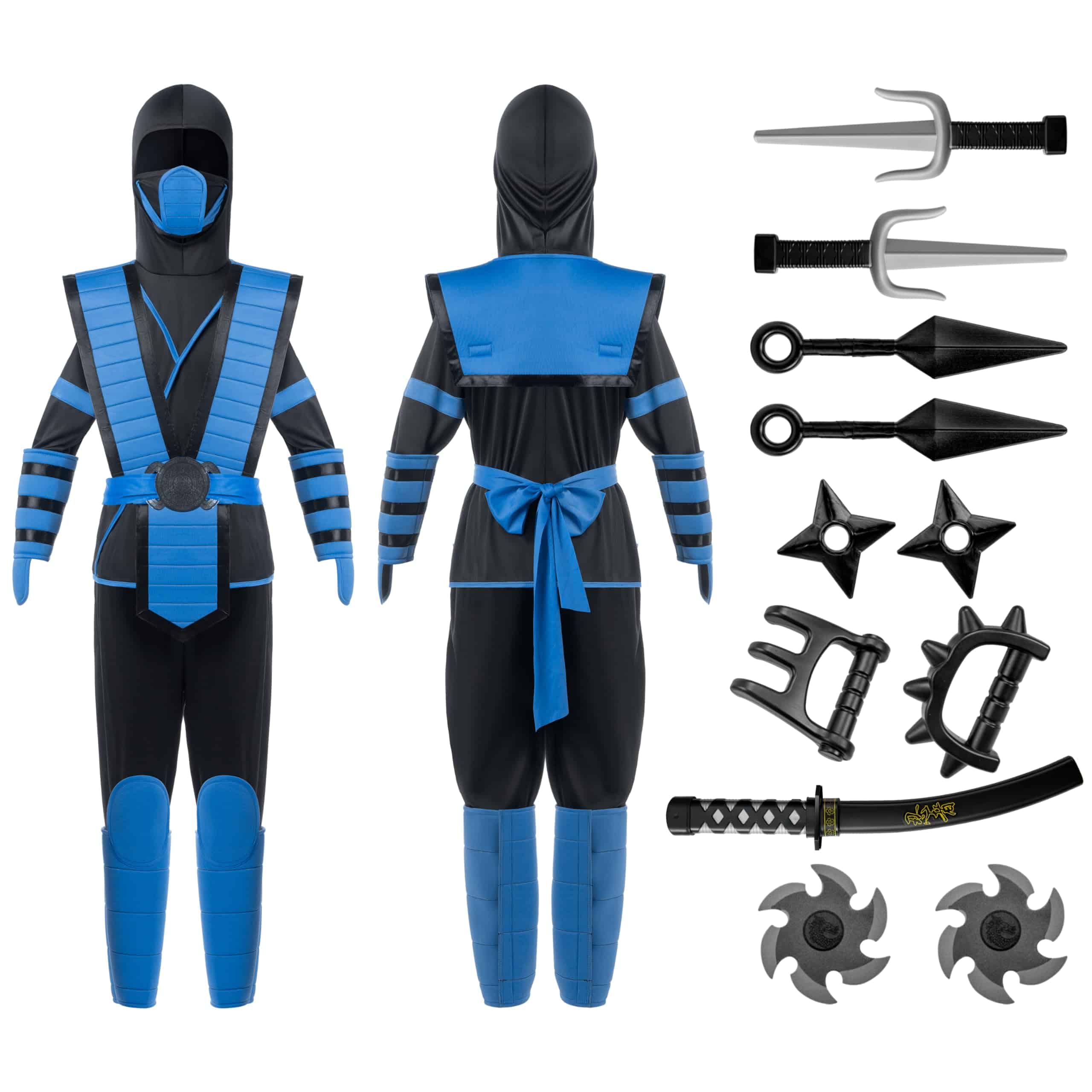 PACK DE SUPER VALOR: El set de disfraz de Ninja incluye un chaleco de ninja azul, una capucha, un par de protectores de muñeca, cinturón, máscara, un par de protectores de pierna, un par de pantalones y dos juguetes de dagas de ninja. Equipa a tu joven guerrero con todos los elementos esenciales para una emocionante experiencia ninja.