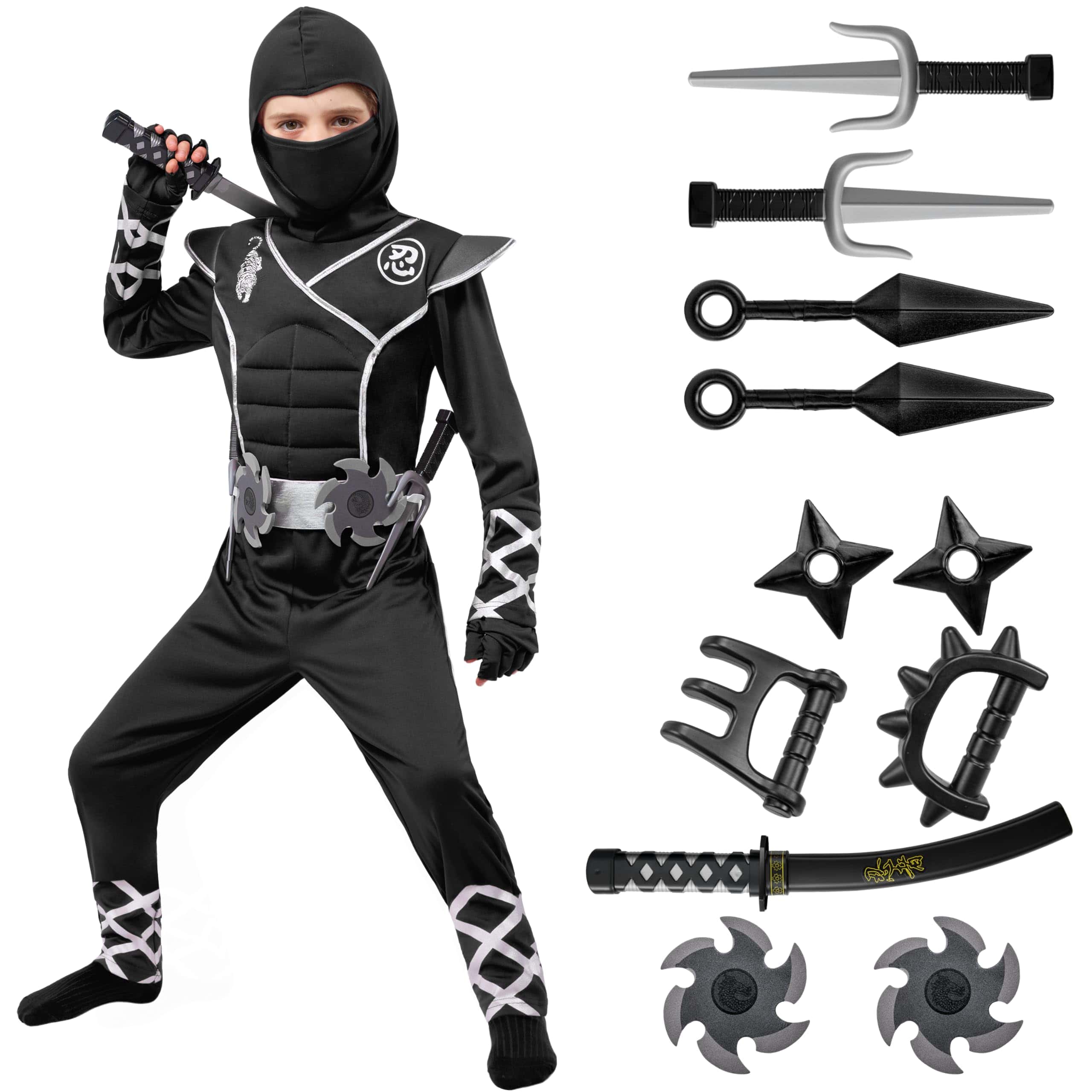 1. 15 PCS Disfraz de Ninja Halloween para Niños e Niñas, Incluye 1 Mono de Ninja Plateado con Capucha Adjunta, 1 Máscara de Ninja, 1 Cinturón, 1 par de Guantes de Ninja, 2 Garras de Juguete, 2 Dagas de Espuma Ninja y otros 7 accesorios de espuma.