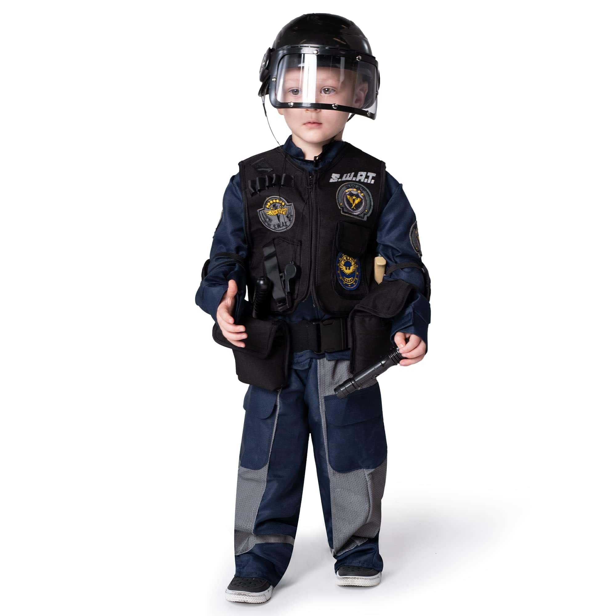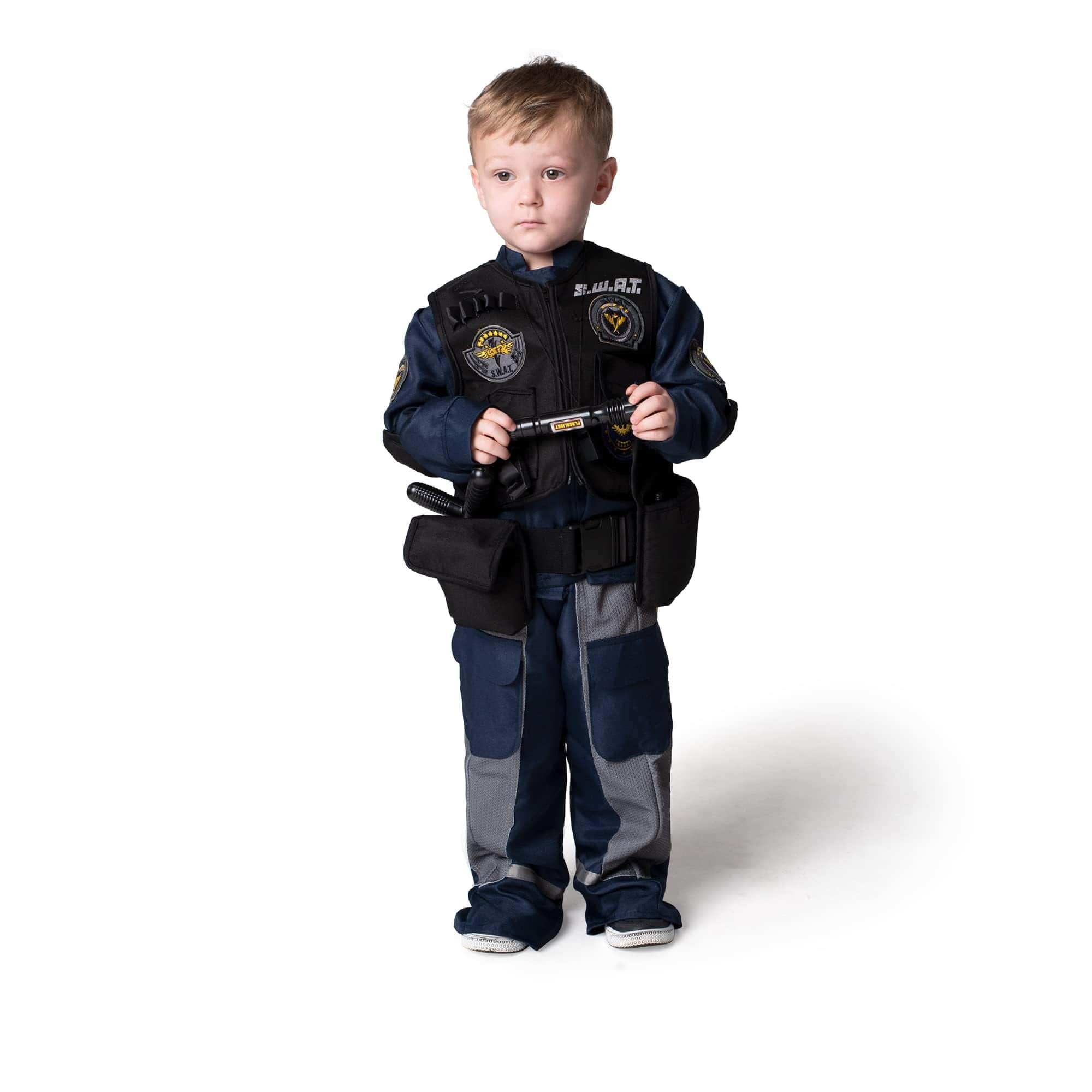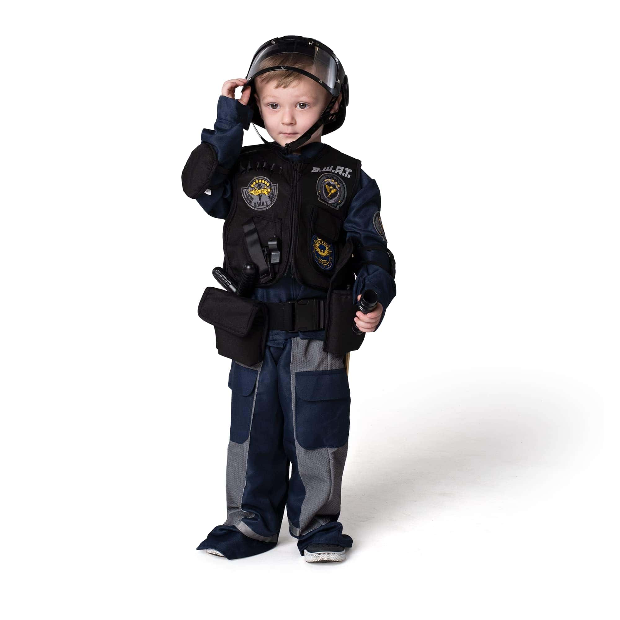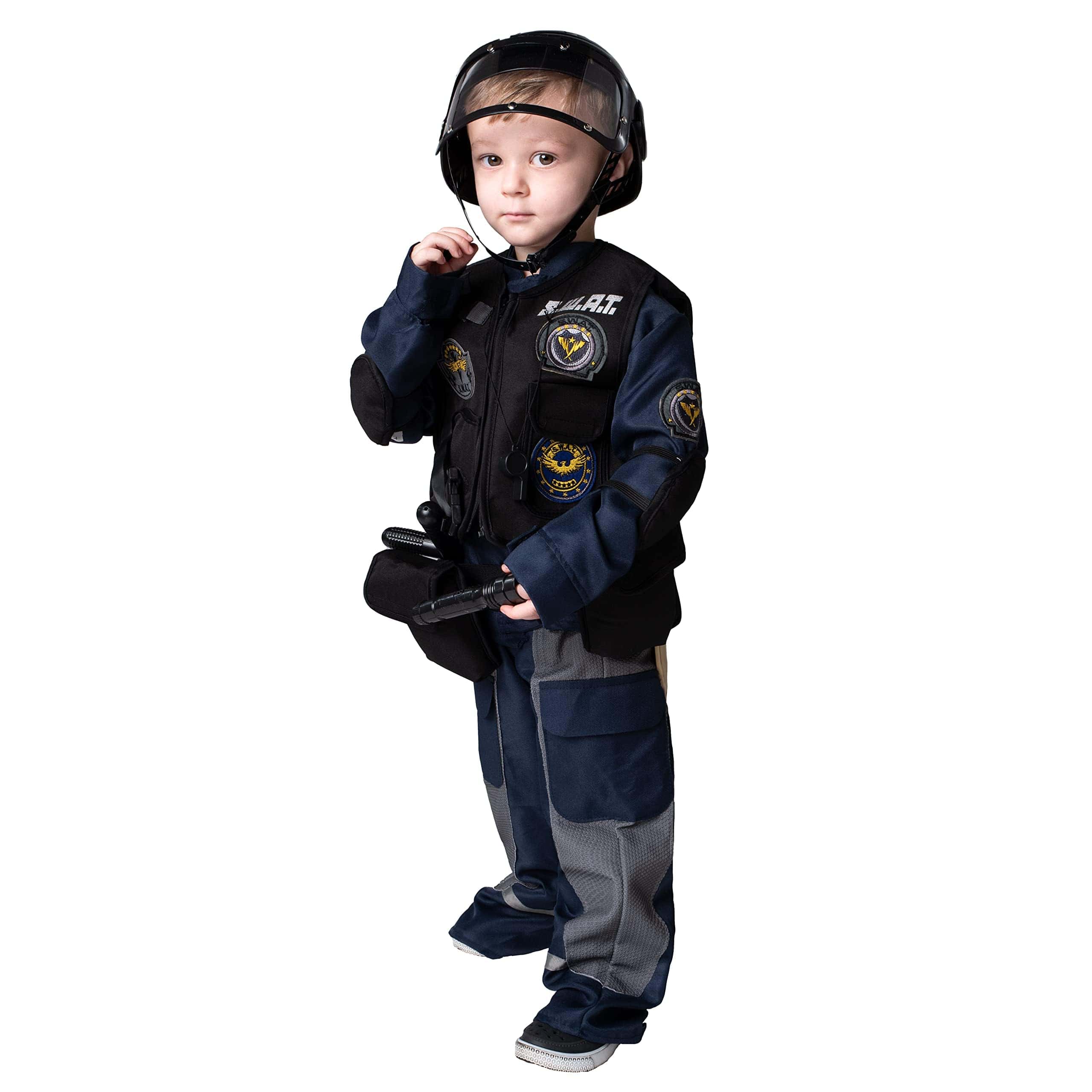 ¿Por qué no disfrazarse de Luchador/Oficial SWAT para la fiesta de Halloween de este año? Spooktacular Creation Deluxe S.W.A.T. Policía Disfraz de Oficial/Luchador para Niños, Fiesta de Halloween, Disfraz de Truco o Trato, Fiestas Temáticas. Nuestro Disfraz de Oficial/Luchador SWAT para Niños viene con el Casco, Camisa, Chaleco, Cinturón, Pantalón, Granada, Walkie-Talkie, Bastón, Silbato, Cuchillo y Linterna. Su hijo se sumergirá fácilmente en el papel de sus héroes. ¡Este disfraz tiene todo lo que necesita para que su hijo juegue el líder de un equipo de policía de élite! ¡Cree recuerdos mientras lleva puesto este disfraz! Disfraz de Oficial SWAT. Duradero y hecho con cuidado. 100% Poliéster. Excelente Valor para Juegos de Rol. Ideal para Fiestas de Disfraces de Halloween, Festivales, Disfraces de Fiestas Temáticas, Disfraz de Halloween, Truco o Trato, Obra Escolar, y Más. Lavar a Mano en Frío. Secar en línea. No blanquear. Aprobado en Pruebas de Seguridad. Fácil de Poner, Disfraz de Halloween Único para Fiestas Temáticas. ¡Idea para Concurso de Disfraces de Halloween digno de Instagram! ¡Agregue Mucha Diversión a su Fiesta de Halloween y Otras Actividades Temáticas! Talla: 3T (3-4 años) Pequeño (5-7 años) Mediano (8-10 años) Grande (10-12 años)