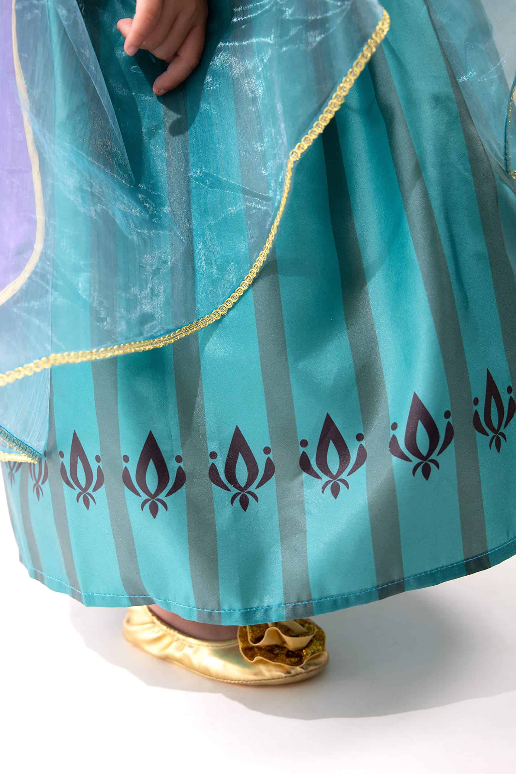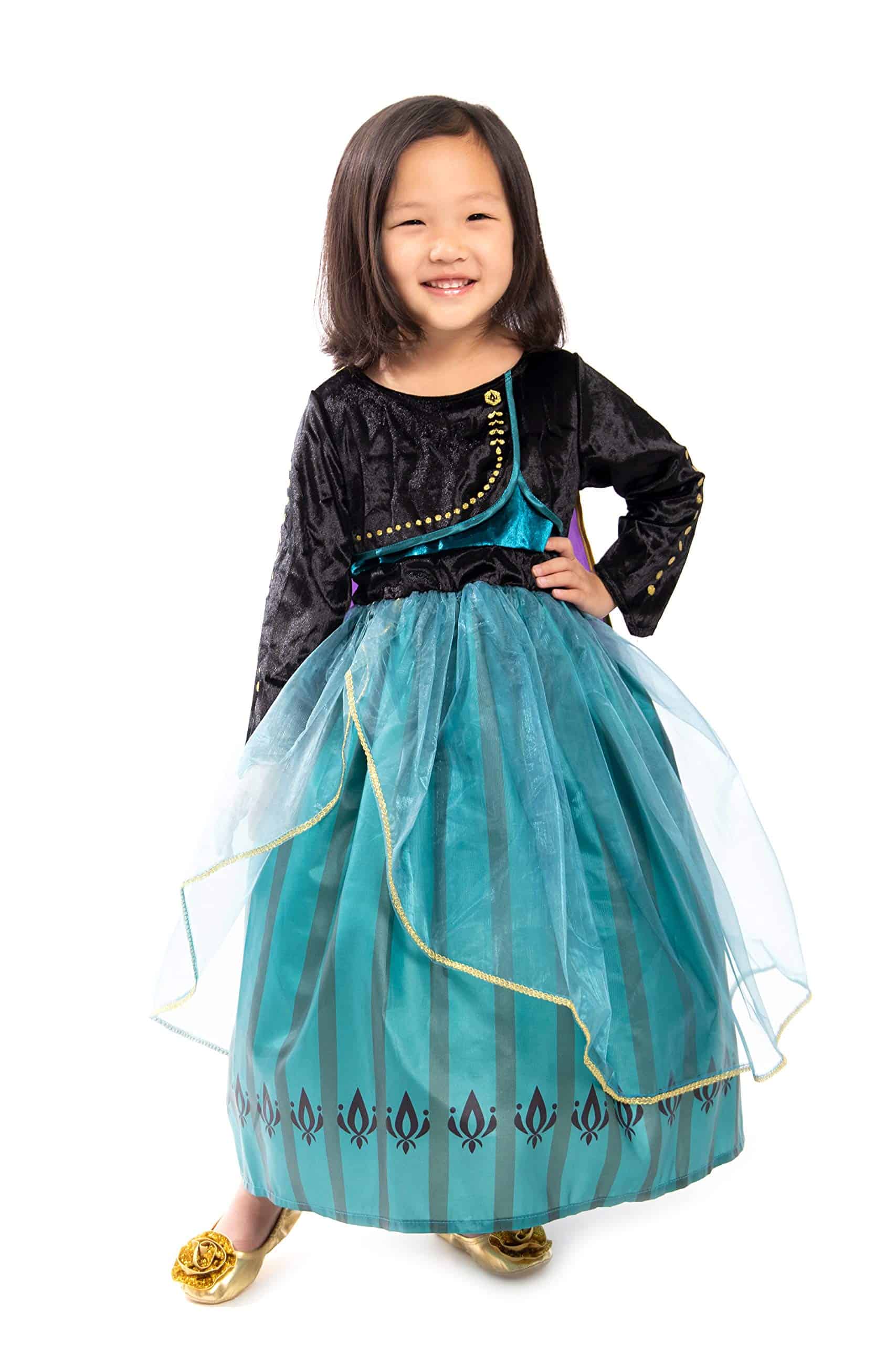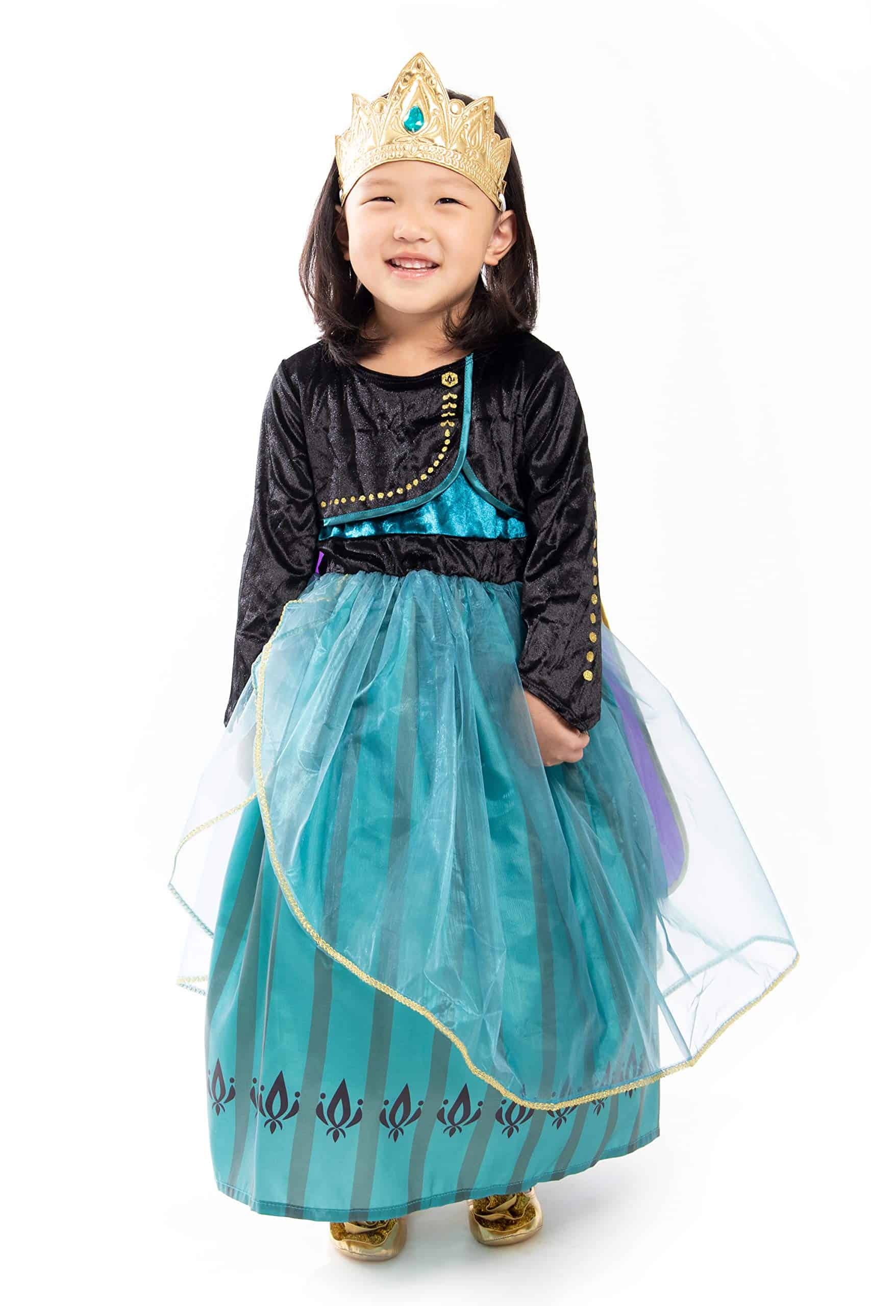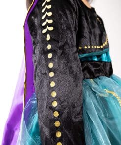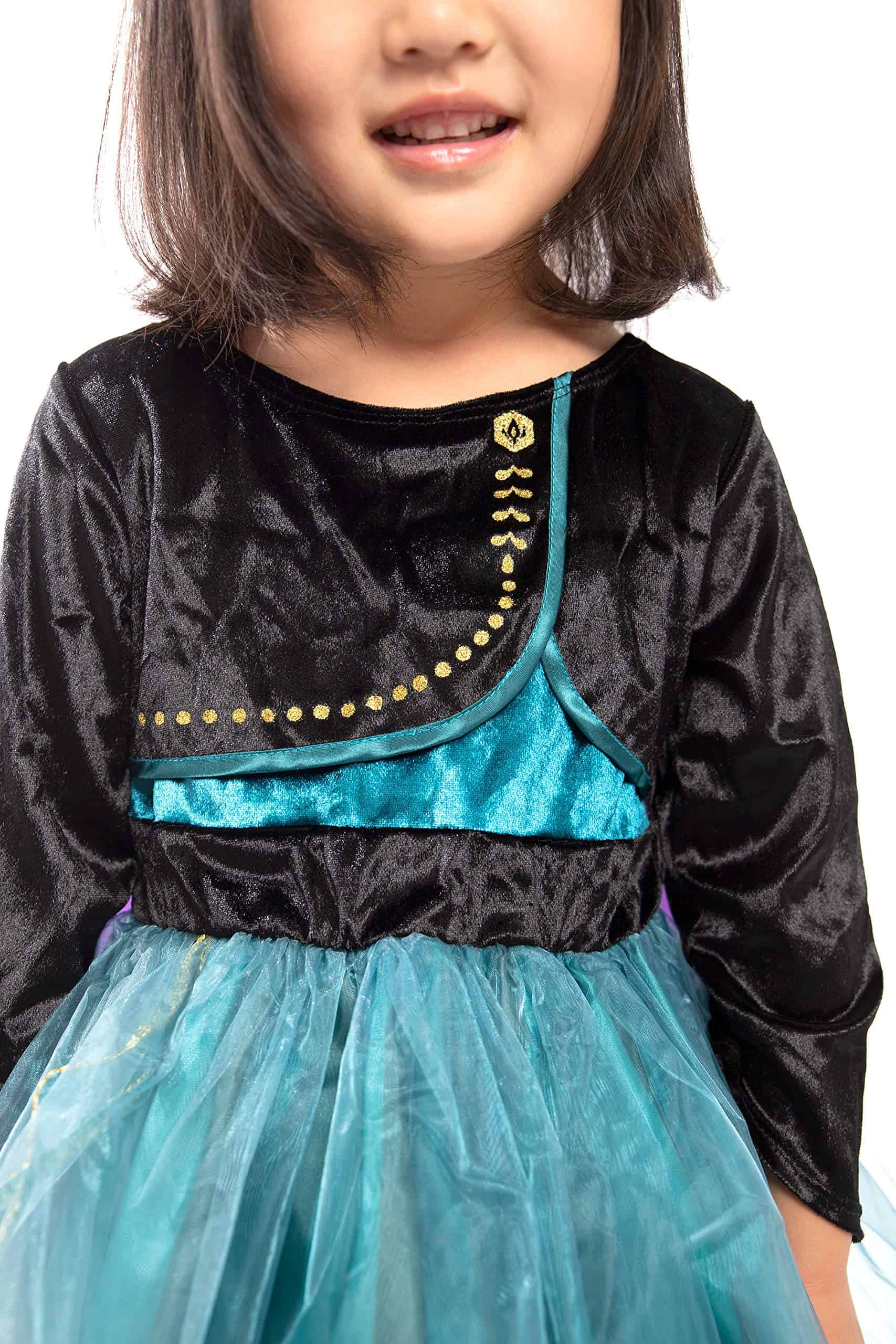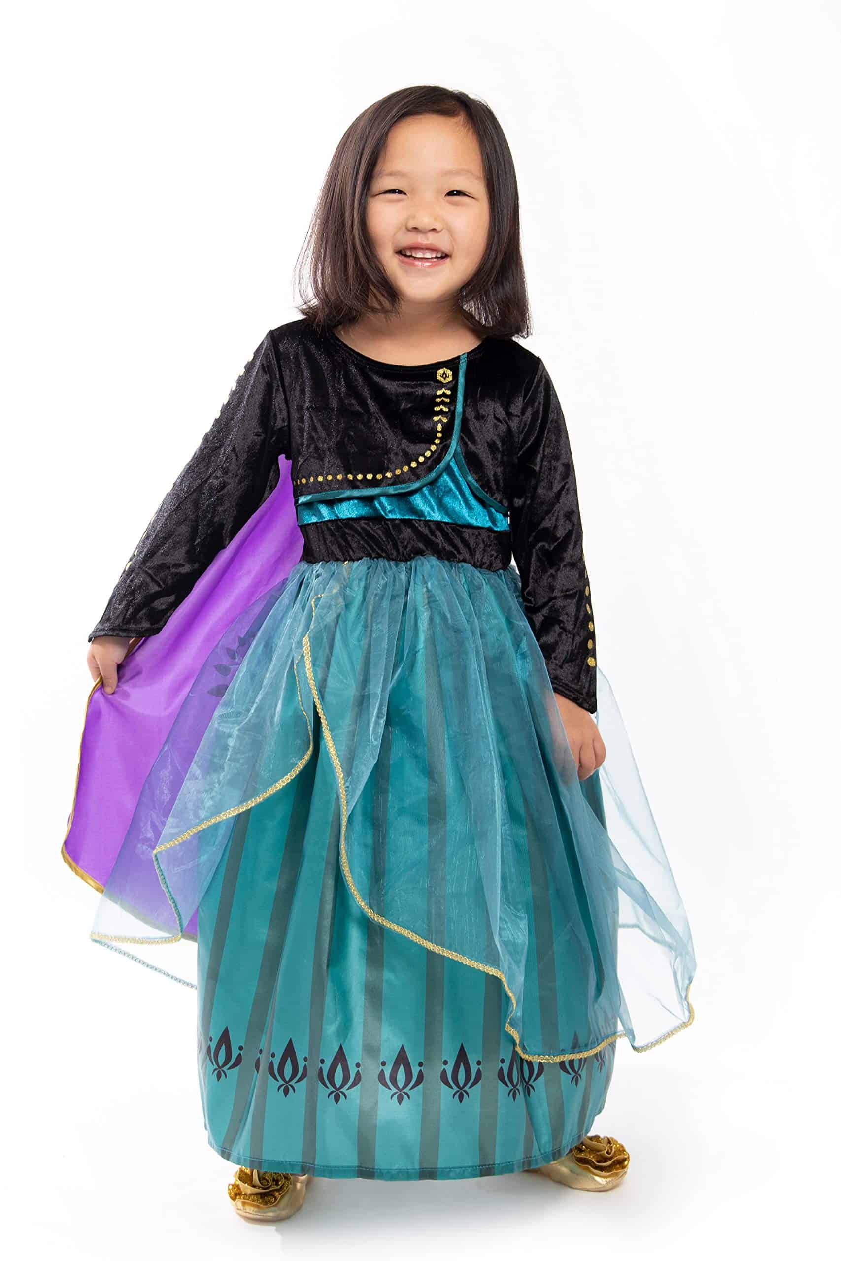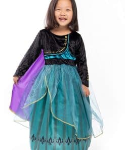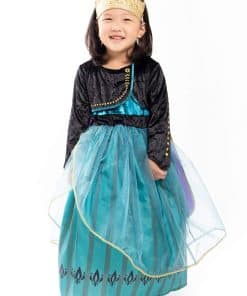 1. ¡Deja que tu pequeño entre en un mundo de imaginación y cumpla su destino de ser Reina en su nuevo disfraz de Princesa Alpina de Coronación Deluxe! El bodic de terciopelo elástico negro con acentos dorados y la falda de seda china verde con diseño de tulipán y organza transparente es hermosa. ¡La capa de seda china morada cosida y los detalles de papel dorado añaden al diseño llamativo!