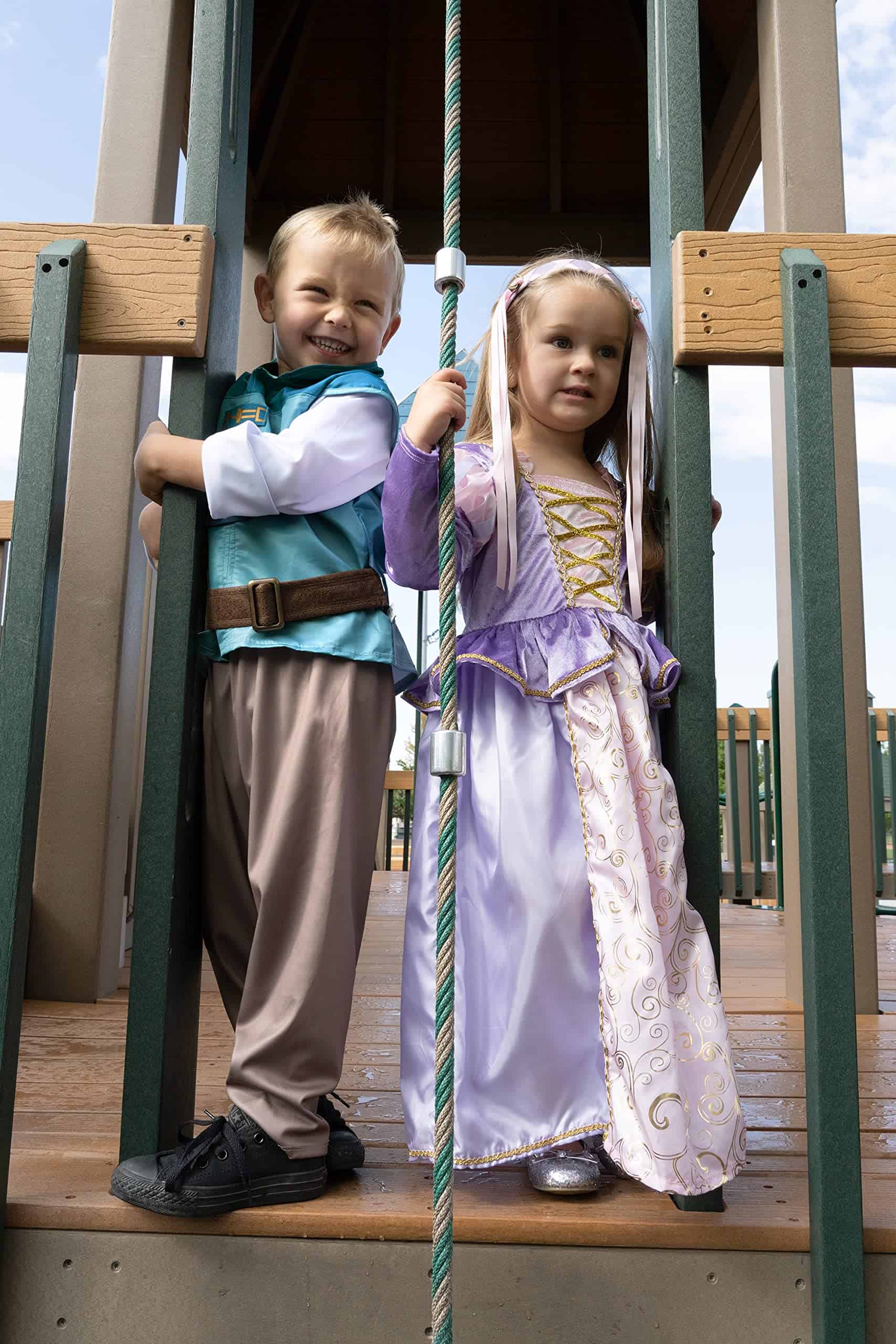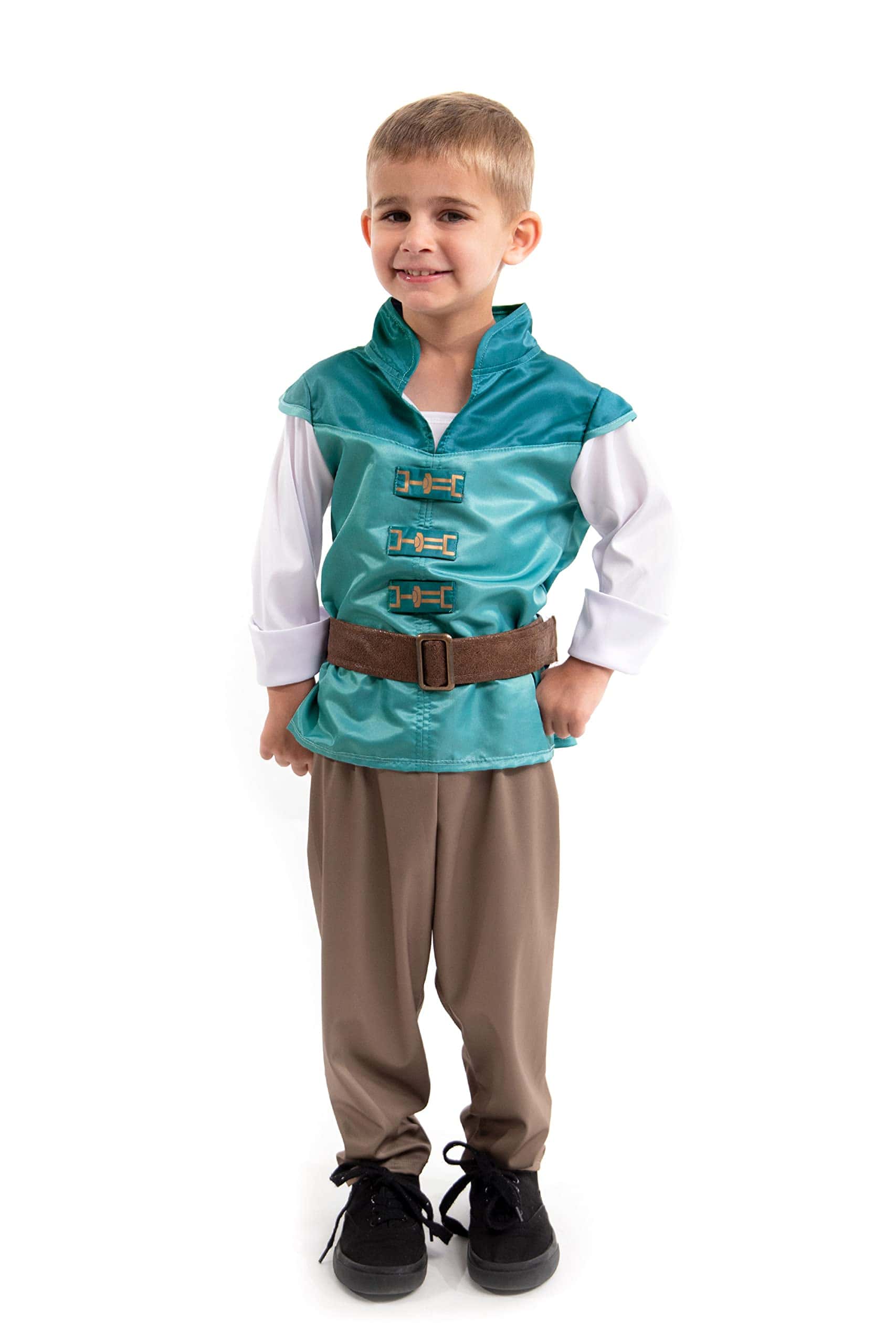 ¡Tu hijo estará listo para emprender una aventura, rescatar a una damisela o cualquier cosa en su nuevo set de Príncipe Torre! El set de dos piezas viene con una suave camisa de té azul de dos tonos con mangas con puños y «hebillas» y pantalones de punto elástico suave con cintura elástica. También viene con un cinturón marrón ajustable de gancho y lazo. No hay telas que piquen y viene con costuras y dobladillos completamente terminados. No hay botones ni cremalleras que frustren los deditos, y lo mejor de todo, ¡es lavable a máquina! Diseñado por dos mamás, Jenny y Heather, con sus propios pequeños príncipes y princesas: ¡los productos Little Adventures son disfraces hechos para jugar todos los días! Heather y Jenny estaban frustradas con el hecho de que los disfraces no se podían lavar. ¡Las telas se deshacían en la lavadora y muchas estaban hechas para limpieza en seco solamente, una idea absolutamente absurda para una mamá práctica! ¡Sabían que tenía que haber una mejor manera! ¡Así comenzó Little Adventures! (Accesorios se venden por separado). ¡CÓMODO – LAVABLE – JUEGO DIARIO – PORQUE LA INFANCIA ES UNA AVENTURA!