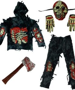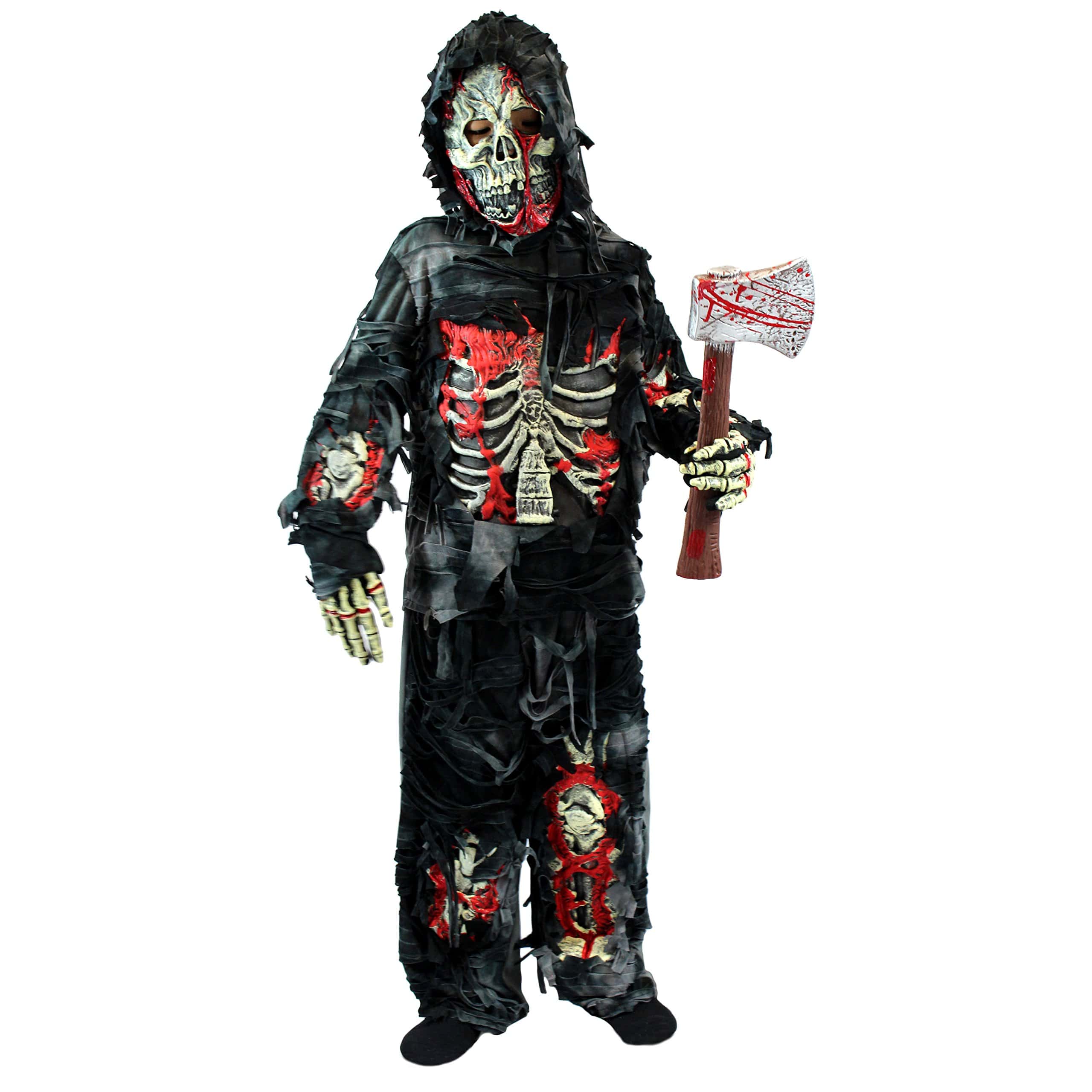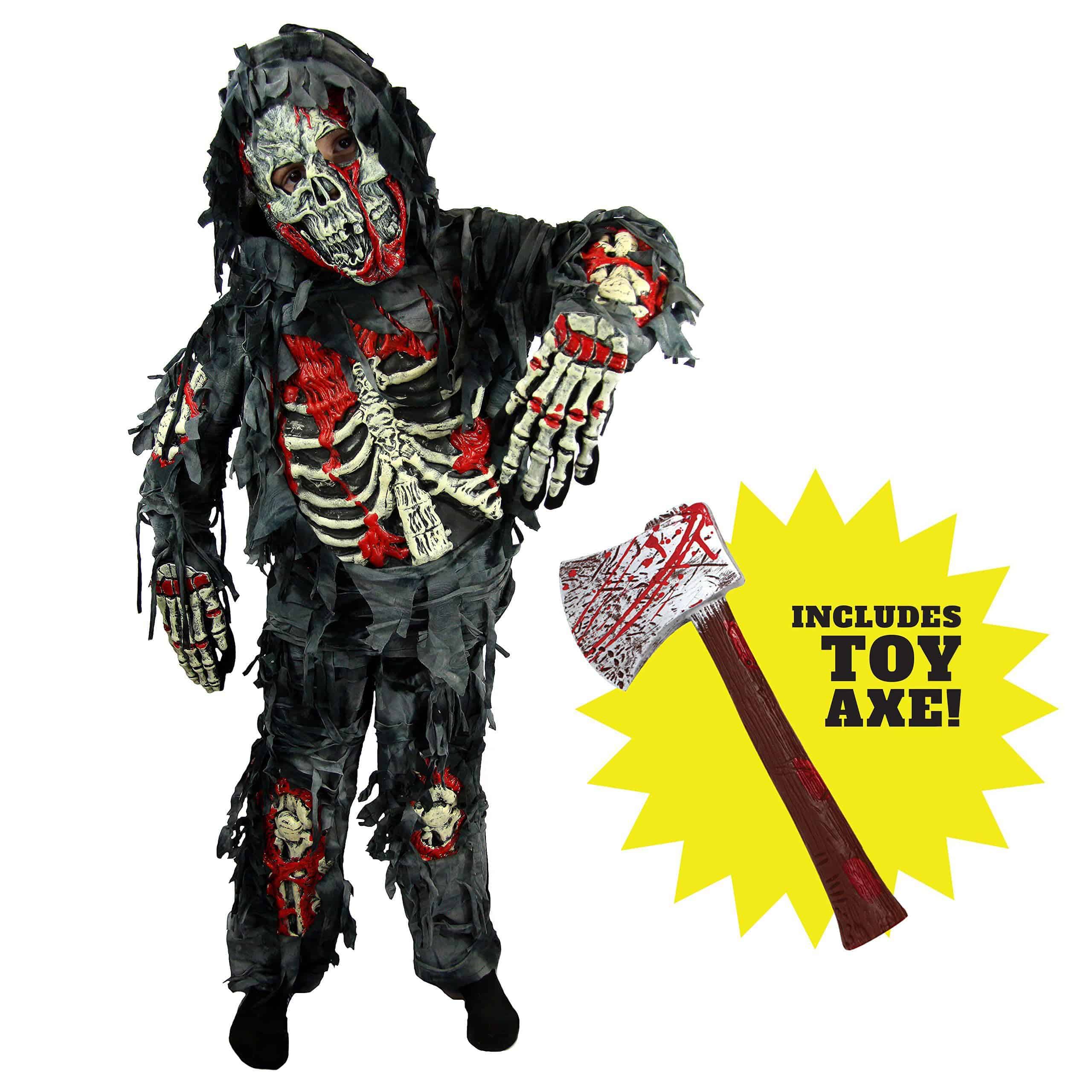 Conjunto de Disfraz de Zombie Deluxe para Niños de Spooktacular Creations. Incluye camisa de manga larga con huesos adjuntos y capucha, pantalones con huesos en las piernas adjuntos, guantes, máscara y hacha de cazador de zombies. Paquete súper valioso para el juego de roles. Perfecto para fiestas de disfraces de Halloween, fiestas temáticas de The Walking Dead, juegos de rol de zombies, actividades, juegos diarios y más. Conjunto de disfraz de lujo. Superduradero. Calidad superior. 100% poliéster. Disfraz de zombie para niños pequeños, disfraz de rol de The Walking Dead, accesorios de zombies, disfraz de zombie, disfraces de Halloween aterradores para niños, ropa de zombie para niños, disfraces aterradores para niños.