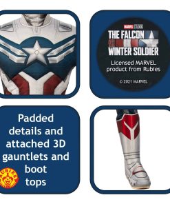 Disfraz Deluxe de Captain America de Marvel: The Falcon And The Winter Soldier. Mono acolchado de lujo para niños con ganteletes 3D y cubrebotas adjuntos, incluye tocado de tela. IMPORTANTE: Los disfraces tienen tallas diferentes a la ropa, utiliza la imagen de la tabla de tallas para niños de Rubies, no elijas basándote en la edad del niño o talla de ropa. Con enfoque en la familia y con sede en EE.UU. desde 1951, Rubies cuenta con disfraces y accesorios clásicos y con licencia en tallas y estilos para toda tu familia.