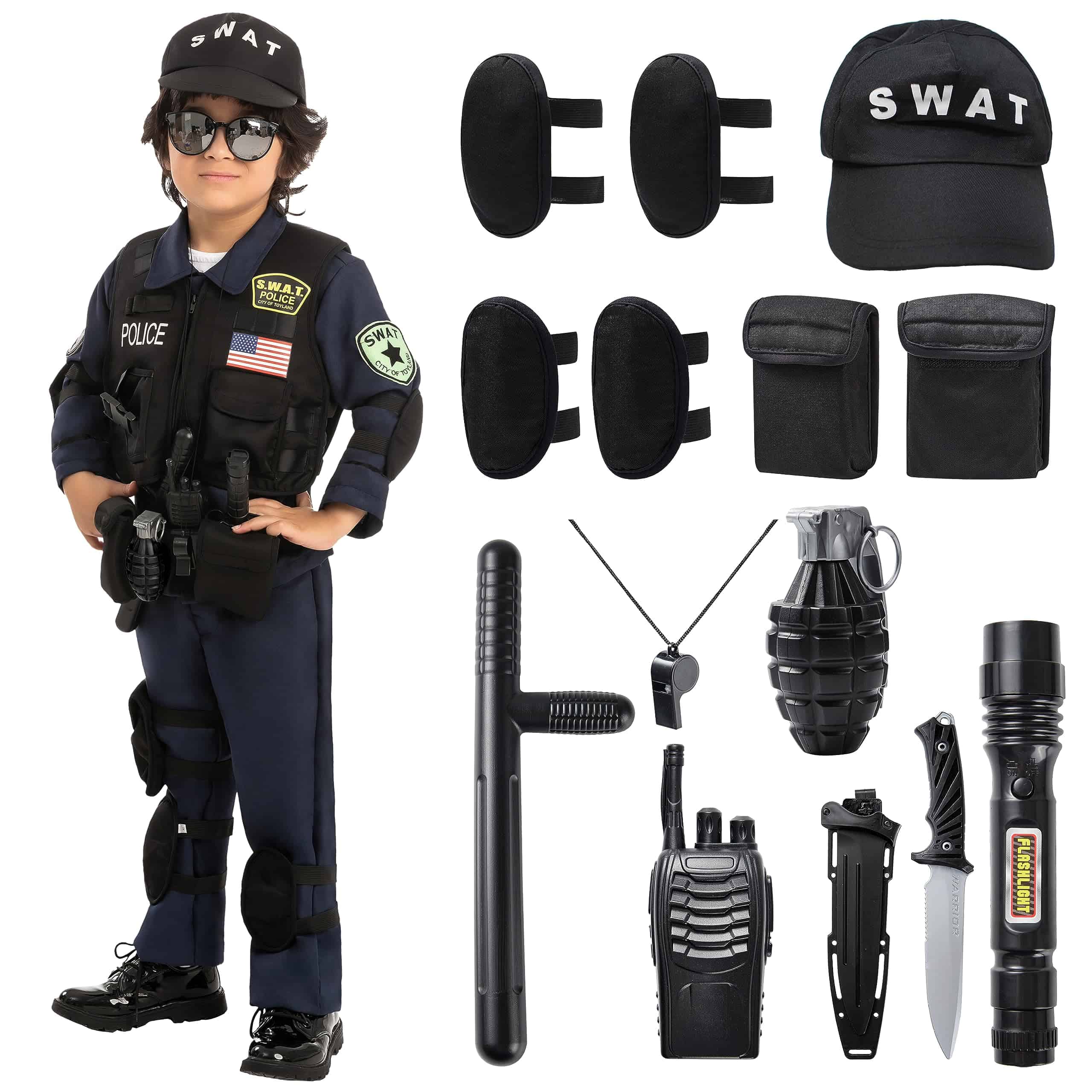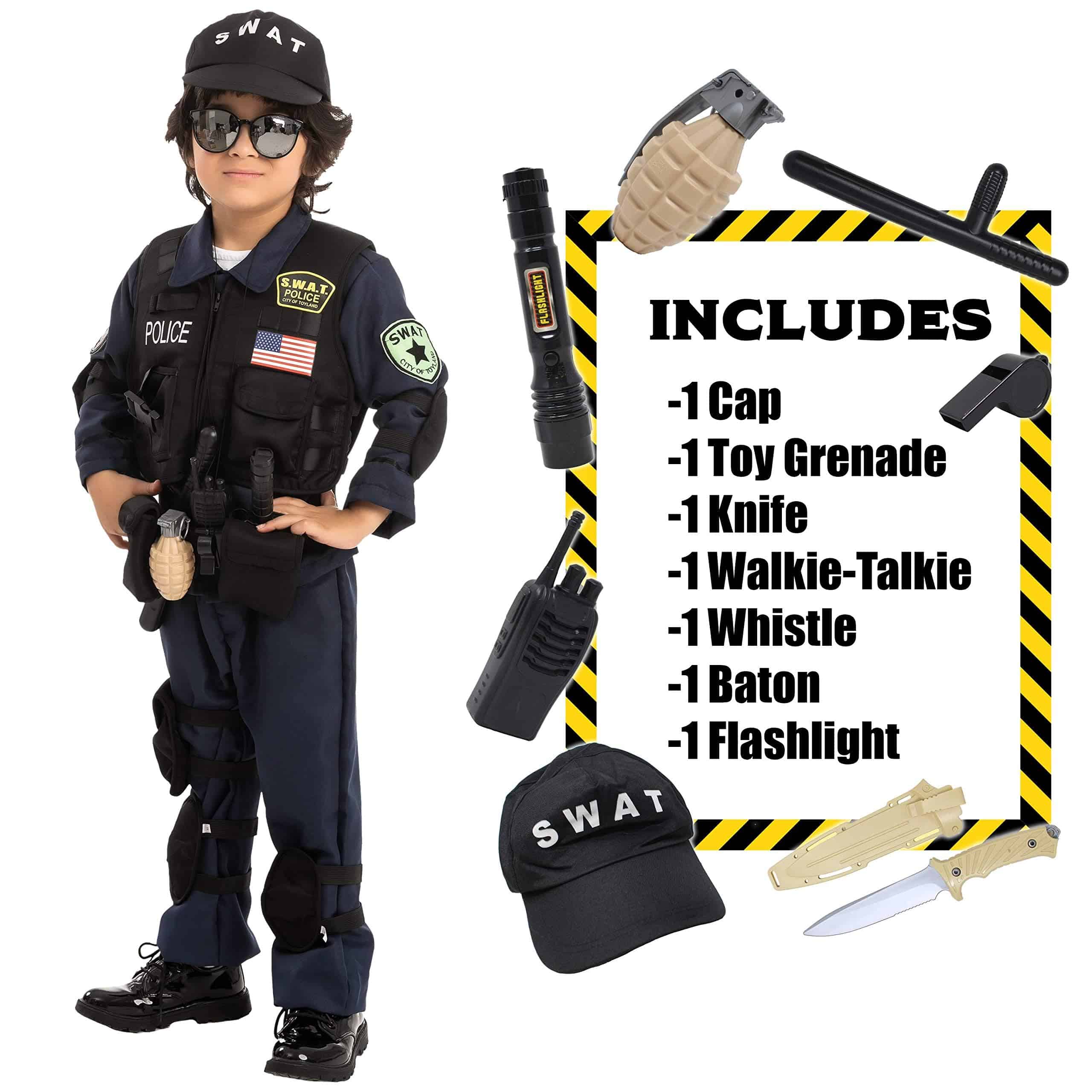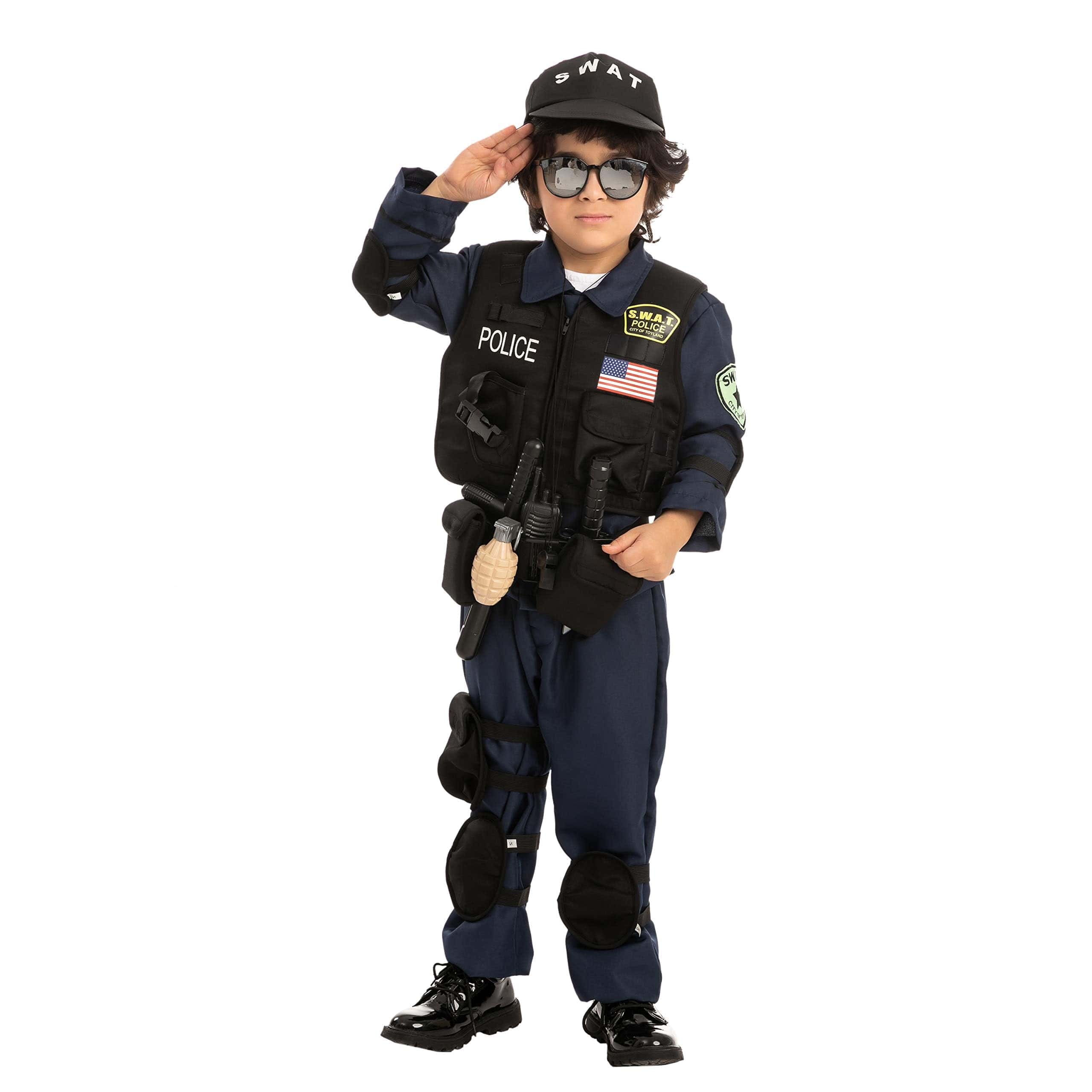 Disfraz SWAT de la Policía Spooktacular Creations para Niños, Disfraz de Oficial de Policía S.W.A.T. para Halloween, Cosplay, Juegos de Rol, Carnaval, Fiestas Temáticas. Disfraz de Swat para Niños incluye un chaleco, camisa, pantalones, gorra, walkie-talkie, silbato y otros tres accesorios para vestir a tu hijo como un verdadero policía de swat. Disfraz de Oficial de Policía para Niños. Garantizado para ser súper duradero porque está hecho de materiales de mayor calidad que también cuentan con su diseño único hecho con 100% poliéster para máxima comodidad. Responde a crímenes y resuelve el misterio del dulce desaparecido! ¡Conviértete en el agente secreto más lindo en tu próxima salida de truco o trato este Halloween! ¡Perfecto para fiestas de disfraces de Halloween, festivales, fiestas temáticas, el mejor disfraz de Halloween, Cosplay, fiestas de Halloween y más. Lavar a mano en frío. Secar en línea. No blanquear. Aprobado por pruebas de seguridad. Fácil de llevar, disfraz de Halloween único para truco o trato. Idea de concurso de disfraces de Halloween digna de Instagram! ¡Agrega mucha diversión a tu fiesta de Halloween y otras actividades temáticas.