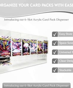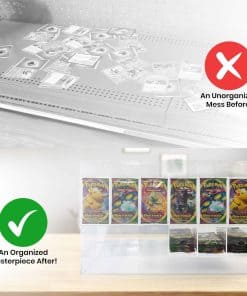Diseñado para almacenar y proteger fácilmente paquetes. En promedio caben 40 paquetes por fila (casi 240 en total). Diseñado para colocarse en mostradores de tiendas. Diseño transparente para exhibir paquetes de refuerzo, cartas deportivas, cartas de juegos y más. Se adapta a muchos paquetes de cartas de diferentes marcas. Apilable, se pueden apilar unos sobre otros si se necesitan varios. Embalaje de espuma para garantizar una entrega segura