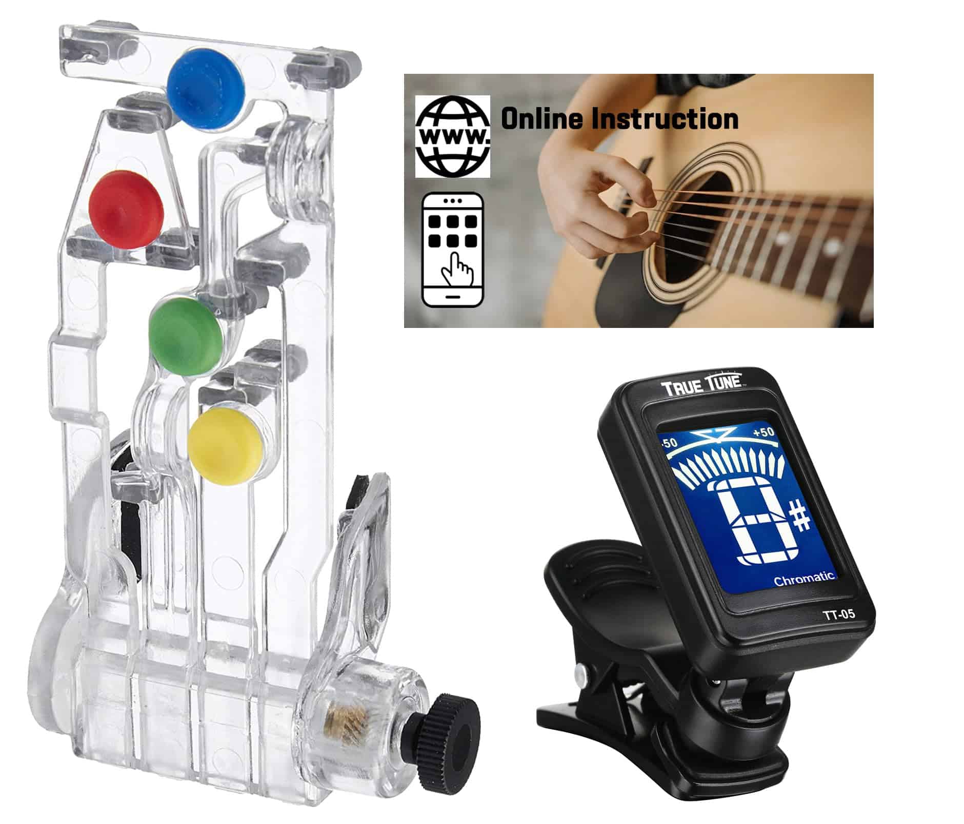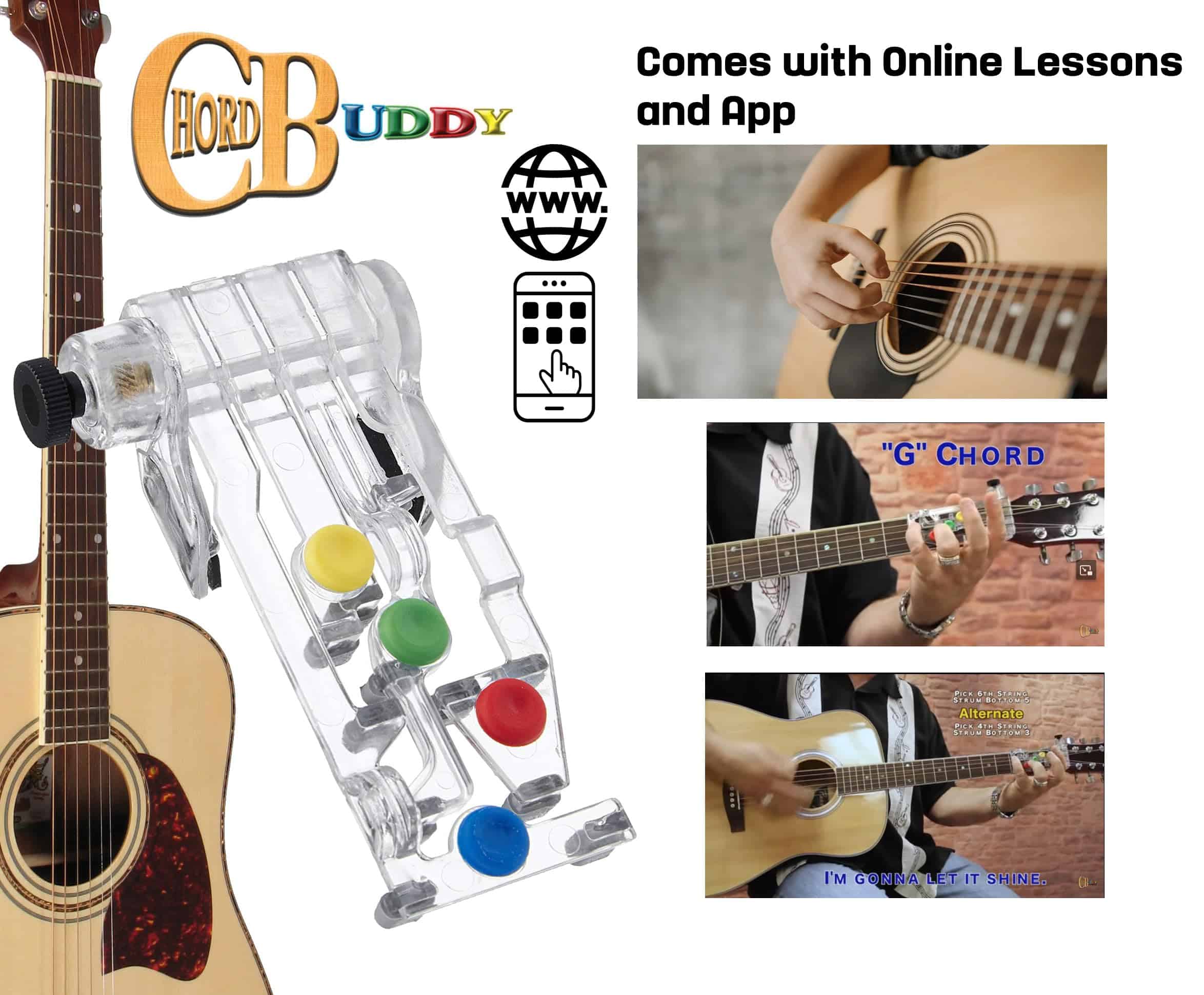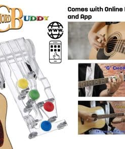 Popularizado en Shark Tank, Chord Buddy es el método de aprendizaje de guitarra probado y verdadero para principiantes. Tan pronto como el Chord Buddy esté correctamente fijado a su guitarra, ¡estará haciendo música! En unas pocas semanas, comenzará a quitar algunas de las pestañas y a hacer los acordes por su cuenta. En dos meses, podrás tocar la guitarra sin el ChordBuddy en absoluto. ChordBuddy funciona en guitarras de tamaño completo. El Chordbuddy hace los acordes G, C, D, Em en la tonalidad de G. Esta lista es para la unidad ChordBuddy, el afinador de guitarra True Tune y el acceso en línea a instrucciones en video y aplicación de iTunes. Esta oferta no incluye libros físicos o digitales, DVD’s, literatura física o digital. No funcionará en guitarras de tamaño medio, de 12 cuerdas o clásicas.