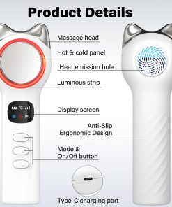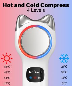 Dispositivo facial multifuncional: esta máquina facial de compresión caliente y fría es adecuada para la limpieza facial y masajes corporales. Proporciona una experiencia integral de bienestar para la piel, permitiéndote disfrutar de un tiempo de relajación de spa en casa. Con 4 niveles ajustables, la compresión caliente varía de 38°C a 41°C a 44°C a 47°C, y la compresión fría varía de 8°C a 12°C a 16°C a 21°C. Se puede combinar con 2 modos de iluminación. La pantalla LED muestra las funciones y los ajustes de nivel, facilitando la operación. La herramienta facial en forma de cabeza de gato está diseñada para el cuerpo y el rostro. Además, hay un accesorio de anillo metálico que puede sostener un algodón empapado en agua de limpieza, para acelerar la eliminación del maquillaje y la limpieza facial con función caliente. El dispositivo facial se apagará automáticamente después de 10 minutos de inactividad. Cuenta con un orificio de ventilación de enfriamiento en la parte trasera para acelerar la reducción de la temperatura y evitar el sobrecalentamiento. El diseño antideslizante facilita su agarre y uso. Los resultados individuales pueden variar con este dispositivo facial, y algunos usuarios pueden requerir un período más prolongado para ver efectos significativos. Es importante usarlo de forma consistente sin interrupciones. Para obtener resultados óptimos, se recomienda combinarlo con crema. Pasos de uso: 1. Después de la limpieza, aplica productos de cuidado de la piel en el rostro y activa el modo de calentamiento para el masaje. 2. Una vez que el producto de cuidado de la piel se haya absorbido por completo, activa el modo de enfriamiento para calmar la piel.