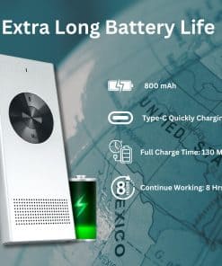 3. Liviano con larga duración de batería Este dispositivo traductor es compacto, portátil y fácil de usar. Disfruta de hasta 8 horas de traducción continua con una sola carga, perfecto para viajes largos o días de trabajo ocupados.