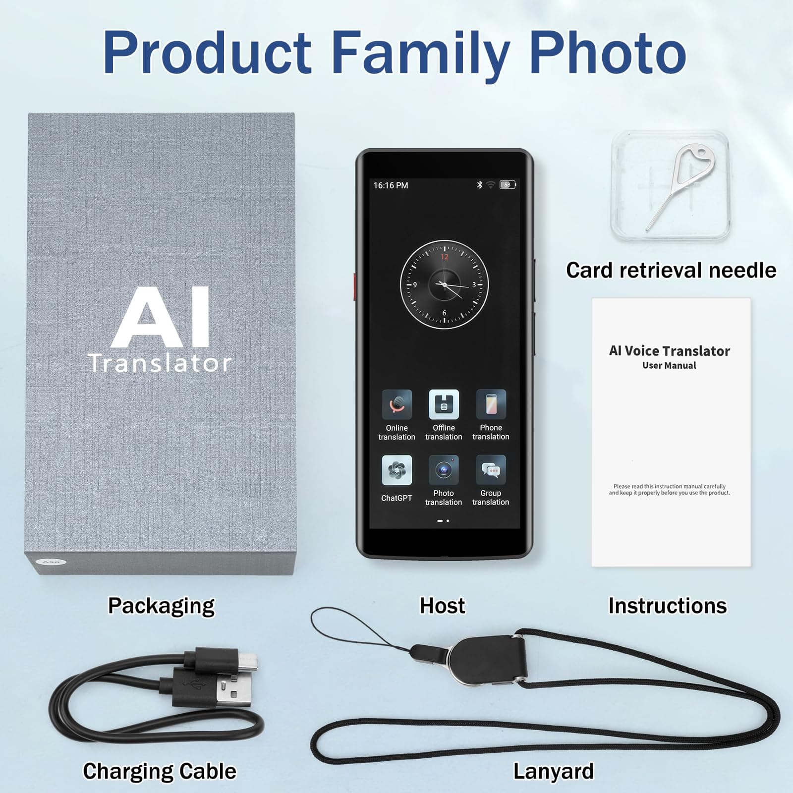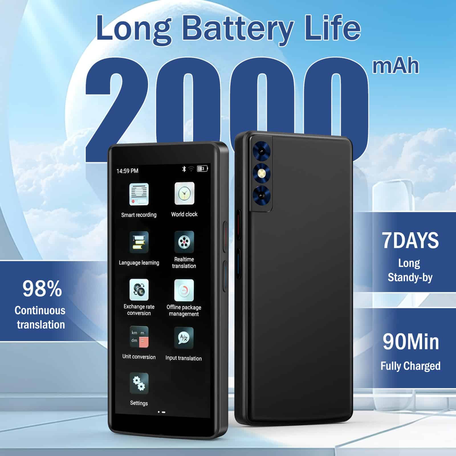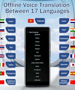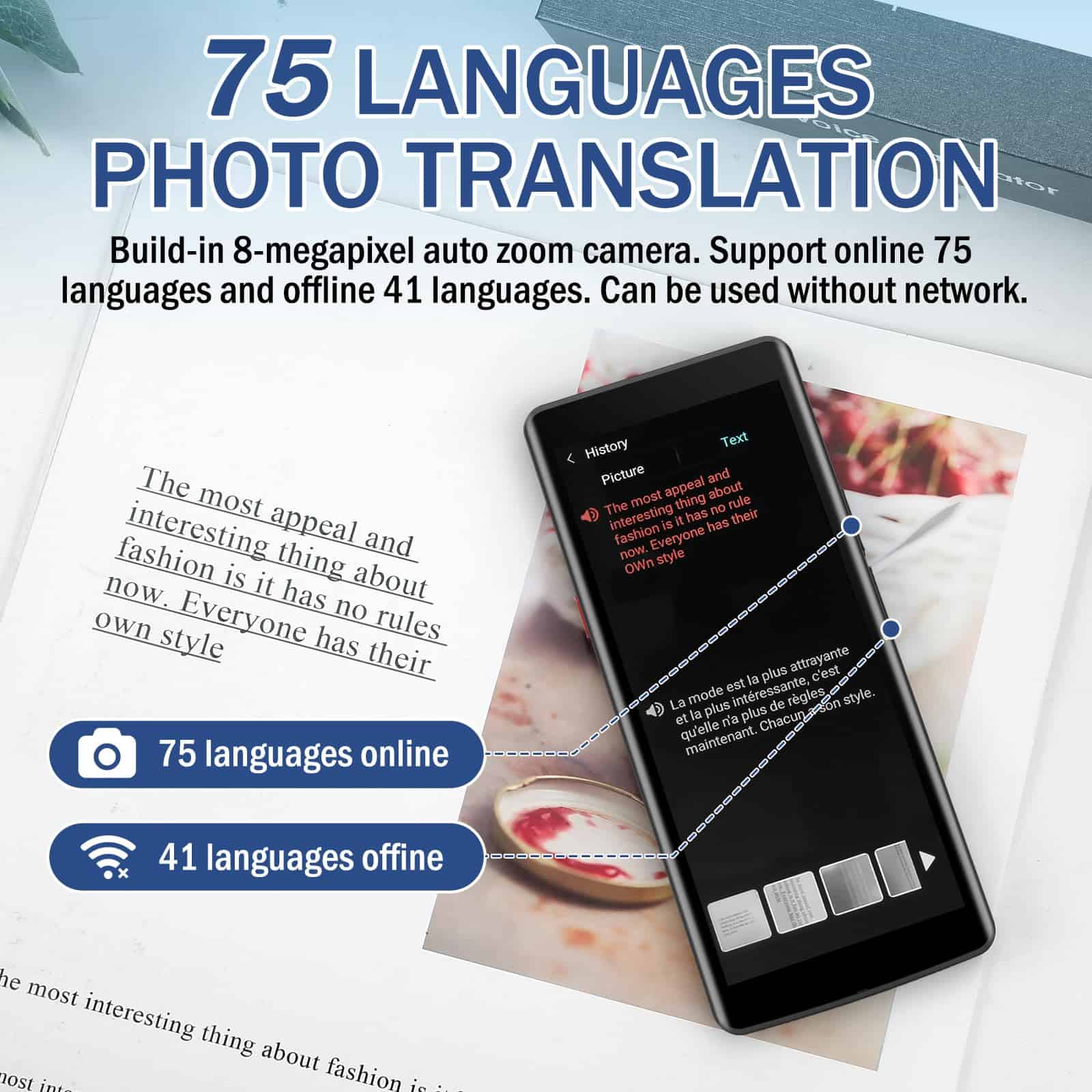 El A50 es un dispositivo de traducción de voz en tiempo real de dos vías. Adopta el mejor motor de traducción en la nube con un 99% de precisión y un tiempo de respuesta de solo 0.1 segundos. Soporte para múltiples idiomas: Este traductor de idiomas admite traducción entre 139 idiomas/acentos, permitiendo a los usuarios viajar fácilmente por más de 200 países y regiones del mundo sin verse limitados por barreras lingüísticas. Soporta traducción offline entre 17 idiomas: inglés, chino, japonés, coreano, árabe, ruso, tailandés, italiano, portugués, chino tradicional, vietnamita, holandés, hindi, indonesio, alemán, francés, español. NOTA: El paquete de traducción offline necesita ser descargado previamente en un entorno con internet antes de su uso. Traducción de imágenes en 75 idiomas: Nuestro traductor de idiomas instantáneo tiene una cámara trasera de 8 millones de píxeles y tecnología OCR profesional, que puede realizar traducciones de imágenes en tiempo real en 75 idiomas online y 41 idiomas offline.