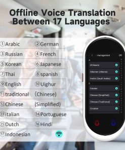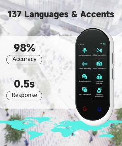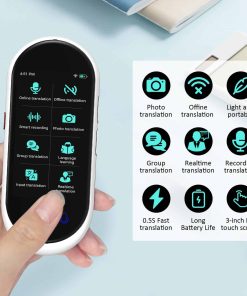 ¡Traduce a 138 idiomas y dialectos para una comunicación sin barreras! Traducción sin conexión en 17 idiomas principales: árabe, alemán, ruso, francés, coreano, japonés, tailandés, español, inglés, chino (tradicional), chino (simplificado), uigur, italiano, portugués, holandés, hindi, indonesio. Traducción de imágenes en 74 idiomas. Velocidad de respuesta <0.5 segundos. No se requiere tarjeta SIM. Actualizaciones de software gratuitas. Compatible con auriculares Bluetooth. Tamaño portátil 11.8 x 5.6 x 1.1 cm. Compatible con conexión WiFi y hotspot. Reducción de ruido de doble micrófono. Pantalla táctil de alta definición de 4.1 pulgadas, visualización de voz y texto en tiempo real. Batería larga y fiable con 8 horas de traducción continua y modo de suspensión de hasta 7 días.