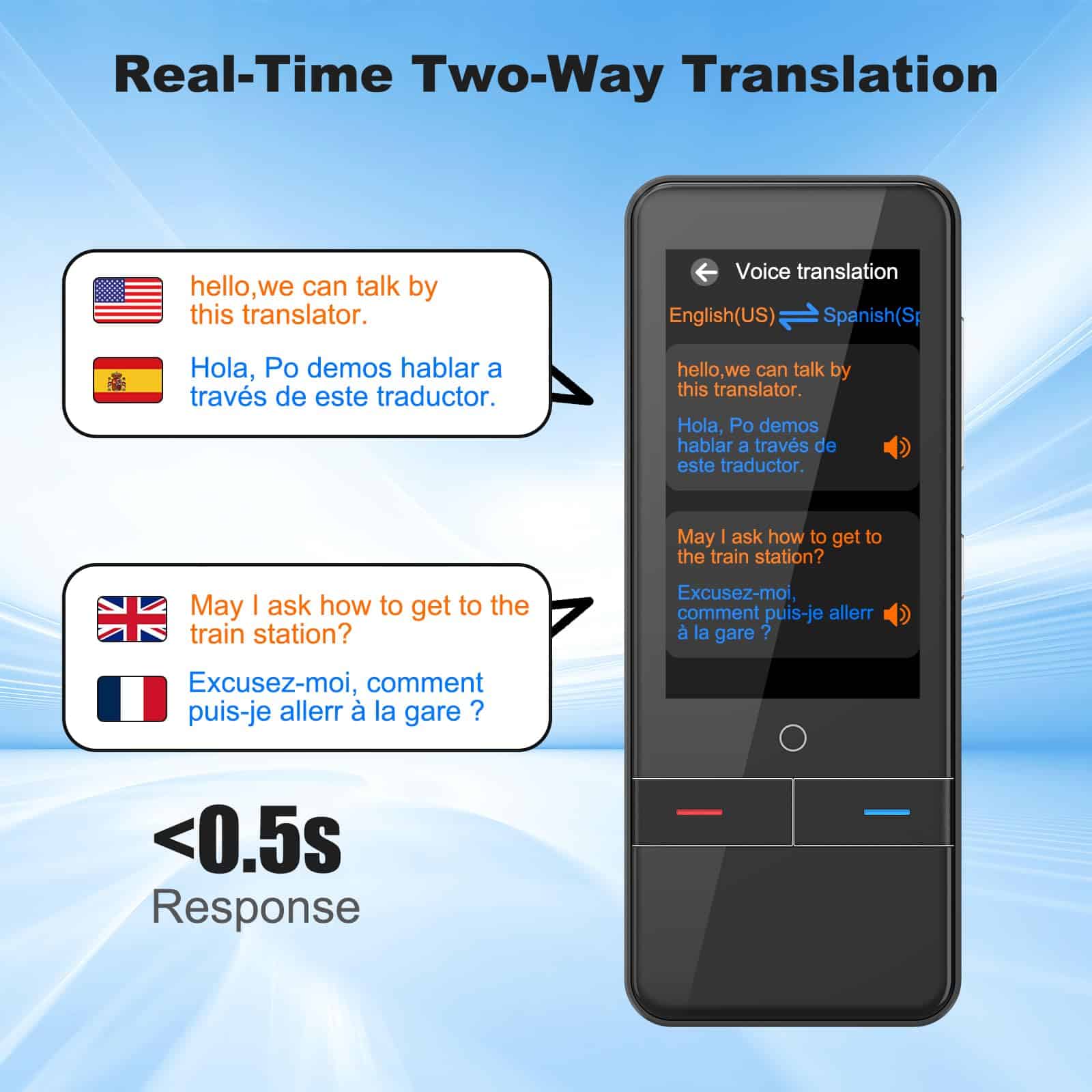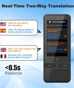 1. Traductor de IA que admite 139 idiomas: El dispositivo traductor de idiomas permite una traducción instantánea bidireccional, lo que facilita conversaciones fluidas en diferentes idiomas. Las traducciones en tiempo real en menos de 0.5 segundos mejorarán tus habilidades de comunicación para romper el silencio más rápidamente y permitirte construir una conexión más profunda. La traducción de voz y texto está disponible en la pantalla táctil HD de 3.0″, con una precisión de hasta el 99%. Este dispositivo traductor inteligente es adecuado para todas tus necesidades de viaje o negocios.