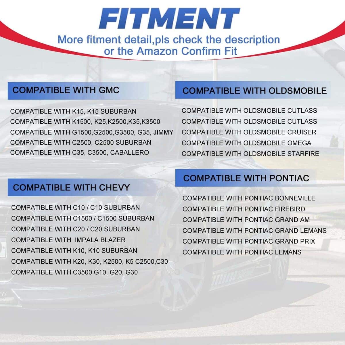 Número de Parte: 850001R, 8362, 850001-2, D100, 850002, D1001, D1002 93440806, 66941R, 66941BK, D1051, 640000 Compatibilidad con Vehículos: Compatible con Chevy C10 / C10 Suburban; Compatible con C1500 / C1500 Suburban; Compatible con C20 / C20 Suburban; Compatible con GMC K1500, K25, K2500, K35, K3500, R3500