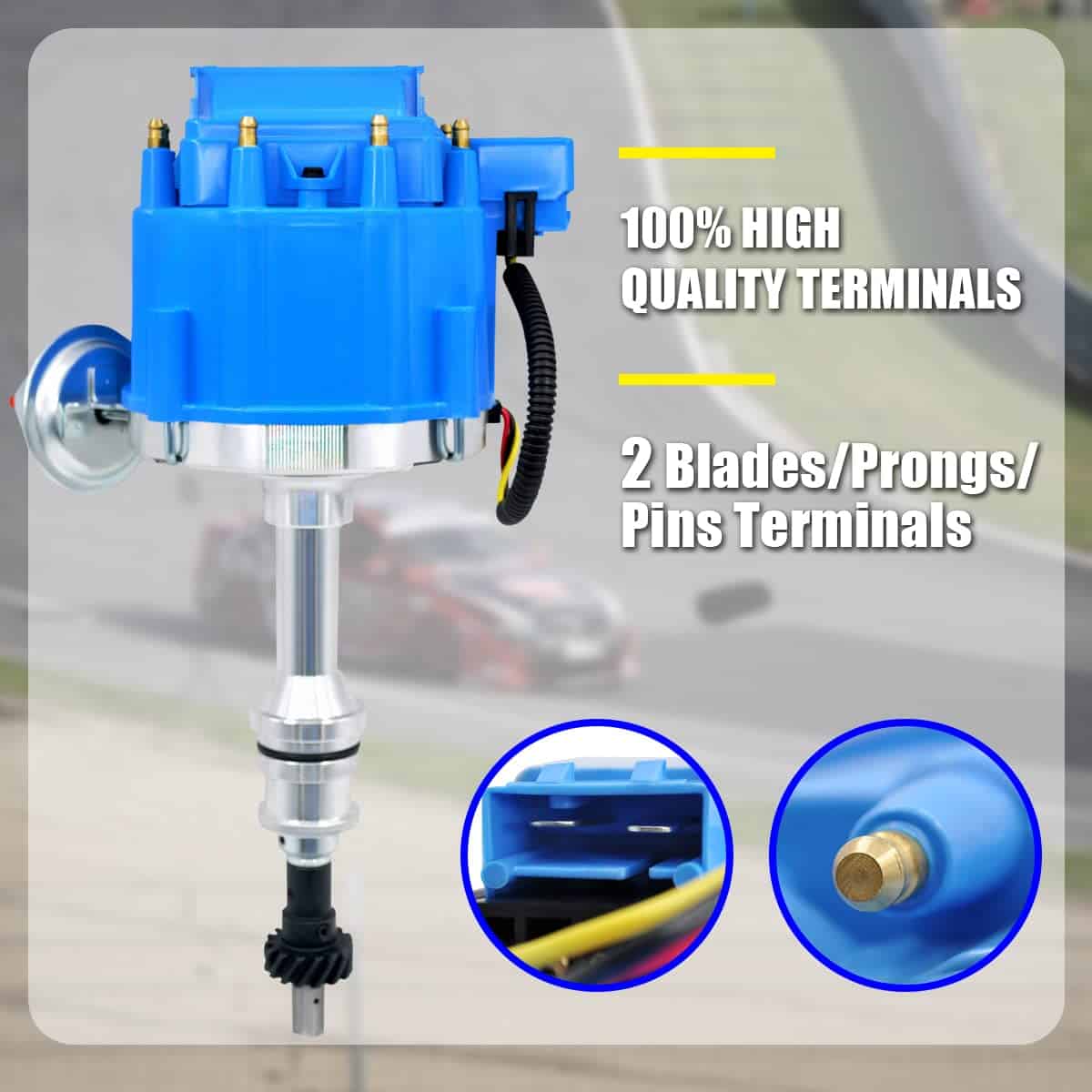 Distribuidor HEI Completo 65K Coil 7500 RPM Compatible con Ford SBF 5.8 L 351W Windsor 8 Cilindros Instalación de un Solo Cable Tapa Azul. Este distribuidor HEI completo cuenta con una chispa de 7,500 RPM y un voltaje de hasta 65,000 para un rendimiento óptimo. Fabricado por un fabricante certificado OE y Heavy Duty, con engranajes de acero endurecido de alta calidad, utilizando el encendido de 4 pines para una durabilidad excepcional. El eje de aluminio pulido y el engranaje de cromo-molibdeno hacen que este distribuidor sea una excelente opción para tu vehículo.