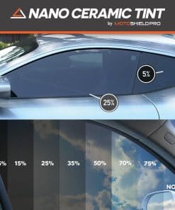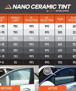 Preserve el interior de tu coche con esta película de ventanas automotriz superior que mantiene alejados los dañinos rayos ultravioleta para evitar daños en tus asientos y tablero, evitando la decoloración y las grietas. Fácil de instalar, esta película de ventanas nano cerámica de solo 2Mil de grosor es relativamente sencilla de manejar. Ofrecemos siete diferentes intensidades para que elijas la película adecuada para tu coche, desde un 5% hasta un 75%. Esta película de ventanas cerámica no se volverá morada ni se despegará después de la instalación. Las nanopartículas extremadamente bloqueadoras de calor en nuestra película de ventanas para coches ofrecen una protección superior contra el calor y los rayos UV, manteniéndote a ti y a tu familia seguros y cómodos durante todo el año. MotoShield Pro ofrece una garantía en nuestras películas de ventanas contra defectos de fabricación y garantiza que nuestras películas mantendrán propiedades reflectantes solares y adhesión sin agrietarse, agrietarse, pelarse, ampollarse o deslaminarse del vidrio.