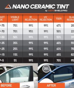 Motoshield Pro Tint Film proporciona una amplia gama de soluciones; para propietarios que buscan actualizar sus ventanas para una mayor protección. Nuestra película es comparable a 3M, con un costo hasta un 60% menor. También somos mejores y más asequibles que Suntek, Solargard y otros fabricantes líderes. Nuestra película cerámica más fresca bloquea hasta 99% UV, 99% IR, 70% TSER y 95% de deslumbramiento. Además, es de nanotecnología y solo tiene un espesor de 2Mils, reduciendo la temperatura interior hasta 25 F, respetuoso con el medio ambiente. La película cerámica es la más alta calidad de película para ventanas.