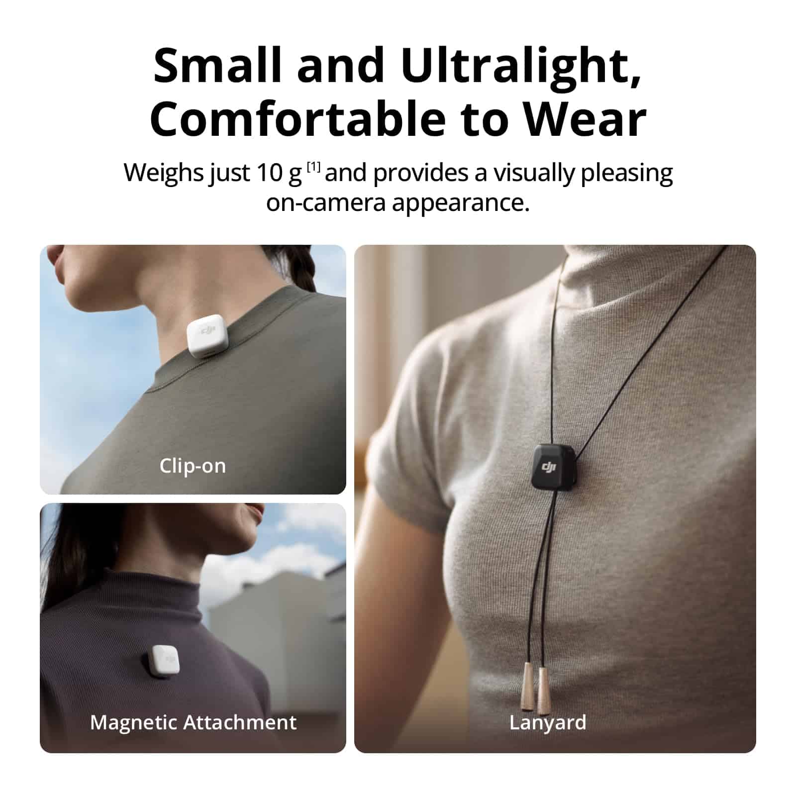 El transmisor DJI Mic Mini es pequeño y ultraligero, pesa solo 10 g, lo que lo hace cómodo de llevar y discreto. Con múltiples opciones de uso como la sujeción magnética y el clip-on, no pesará en tu cuello ni se volteará hacia afuera, incluso en camisetas delgadas, garantizando una apariencia más estéticamente agradable en cámara.