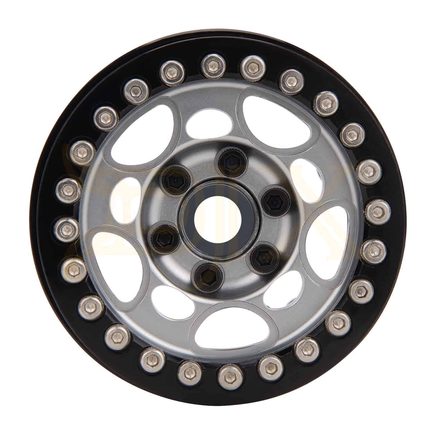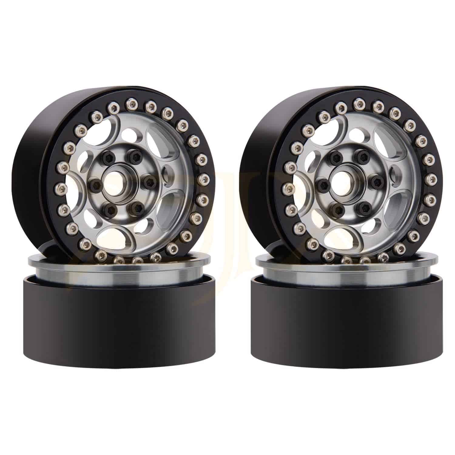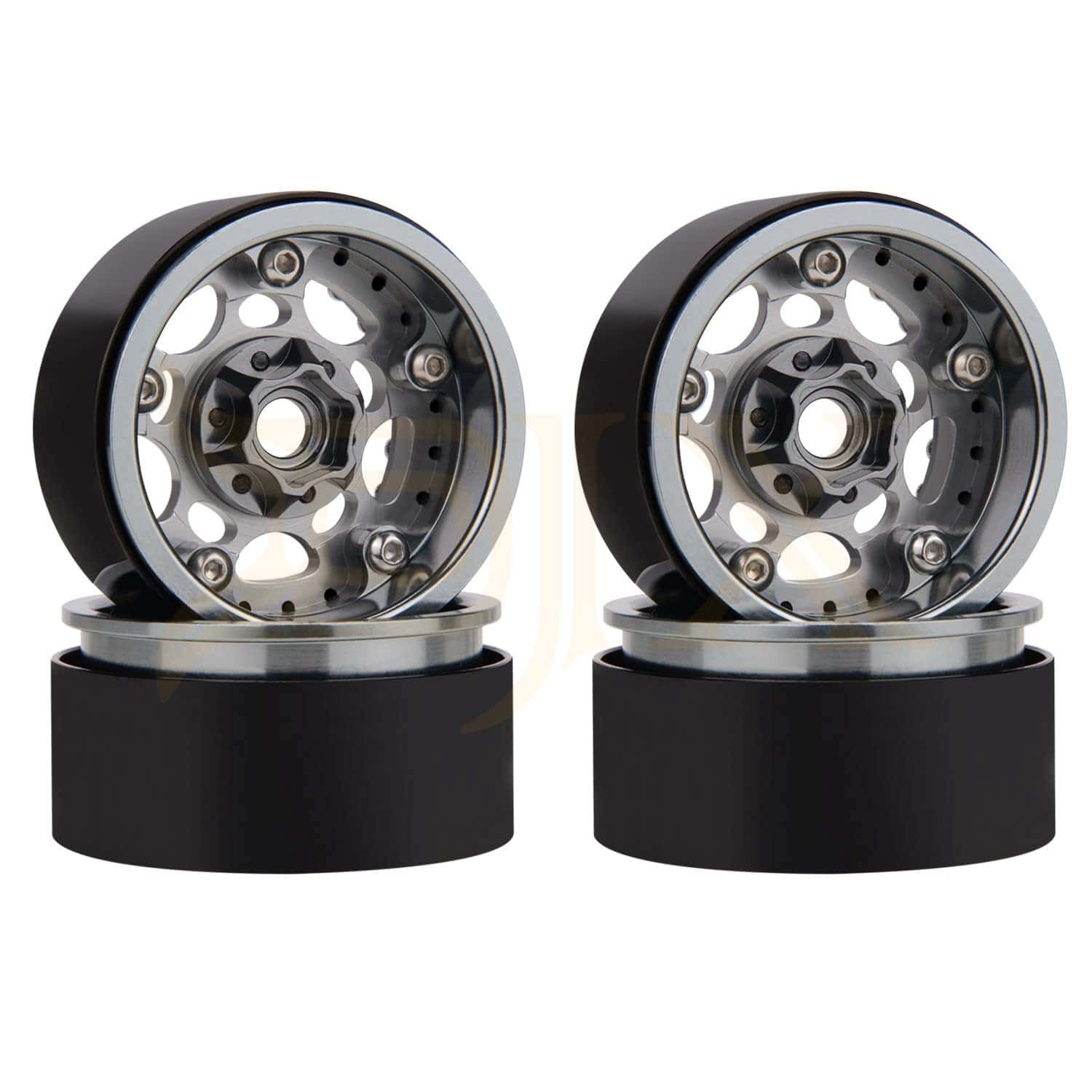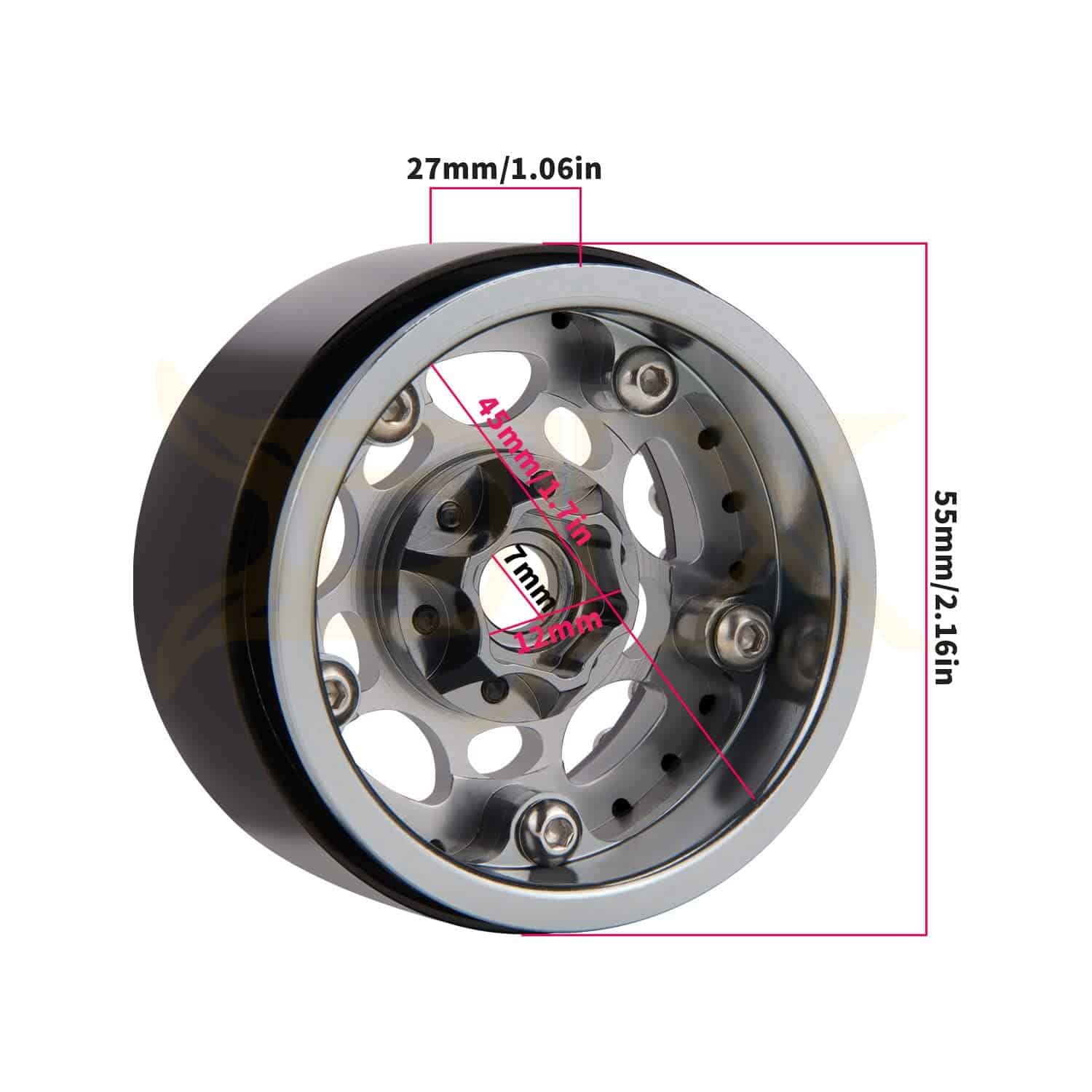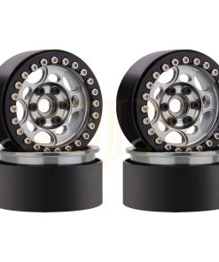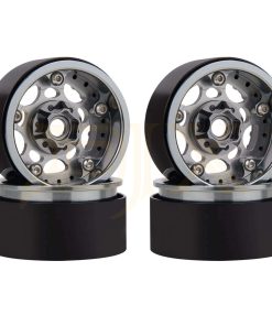 Especificaciones: Material: Aleación y Metal Atributos de tracción en las cuatro ruedas: Neumáticos Color: Titanium y Black Cantidad: 4PCS Peso: 79g/unidad Altura total: 55mm Ancho total: 27mm Diámetro del agujero: 7mm Hexágono de transmisión: 12mm Adecuado para: Coche Crawler de Roca RC 1/10.