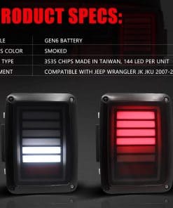 DKMGHT Luces Traseras LED Gen6 Battery Smoked para Jeep Wrangler JK que mejoran drásticamente el estilo y el rendimiento. Diseño de lente 4D con respuesta más rápida de encendido/apagado. Calidad premium Aprobada por DOT. Nuestras luces traseras están fabricadas con una carcasa exterior de ABS negro duradero y lente de PMMA ahumado. Chips LED de alto rendimiento 3535 (Hechos en Taiwan) son más eficientes en consumo de energía que las bombillas de fábrica. Más de 50000 horas de vida útil. Fácil instalación Diseñado Plug & Play, todo lo que necesitas es atornillar. Por lo general, se instala en 15 minutos o menos. Compatible con Jeep Wrangler JK JKU 2 Puertas / 4 Puertas 2007-2018. Compra sin preocupaciones DKMGHT se enorgullece de ofrecer un producto de calidad. Ofrecemos garantía de 365 días. (1) Si no encaja en tu JK Devuélvelo; (2) Si causa código de falla, parpadeo, humedad dentro de la luz Contáctanos para encontrar una solución; (3) Defectuoso o LED se apaga Obtén un reemplazo nuevo; (4) Cualquier problema con las luces DKMGHT, ¡solo contáctanos!