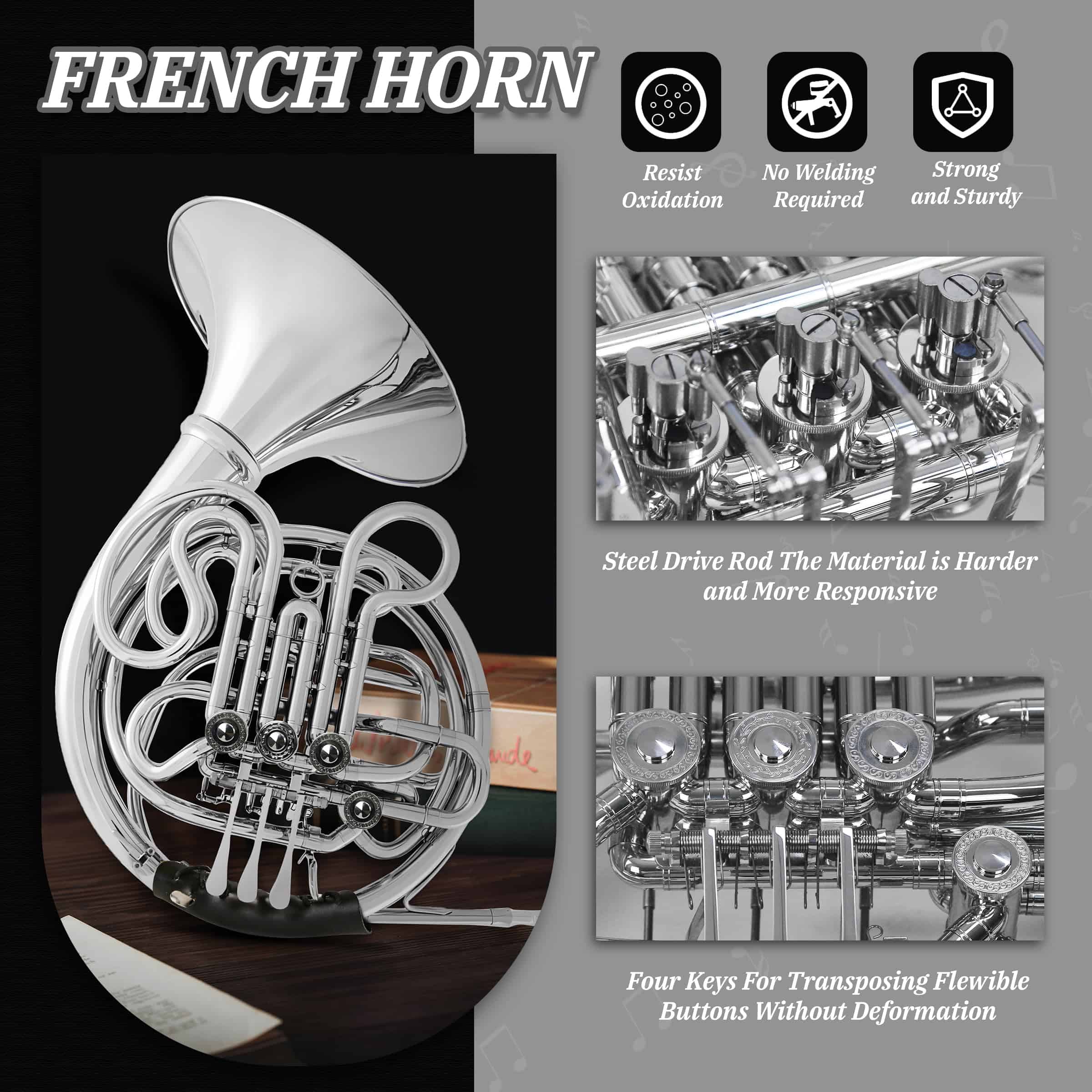 5. Las teclas de la trompa francesa son flexibles, precisas en su operación, no se resbalan fácilmente al tocar durante mucho tiempo y las varillas de transmisión de alta calidad son resistentes a la oxidación, no se oxidan fácilmente y extienden su vida útil. El diseño de anillo ajustable no se cansa fácilmente, proporciona un buen soporte y es cómodo de sostener.
