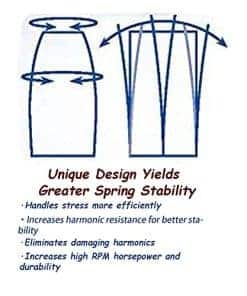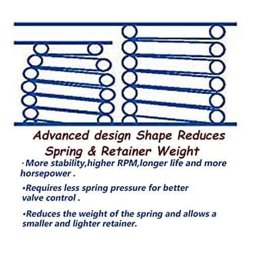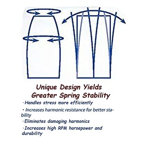 3. Durabilidad – La forma diseñada única maneja el estrés del tren de válvulas de manera más eficiente para eliminar armónicos dañinos y aumentar la potencia y durabilidad a altas RPM. La forma de alambre ovalado/multiarco coloca la máxima área del alambre en el punto de mayor estrés para manejar el estrés del tren de válvulas de manera más eficiente y permitir una mejor disipación del calor para una vida útil más larga. Debido al diseño único, el tren de válvulas puede manejar más RPM y perfiles de leva más agresivos.