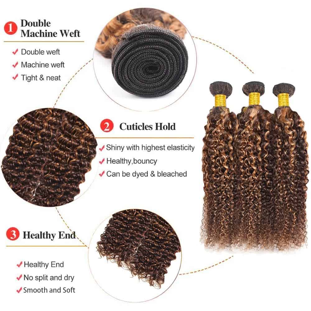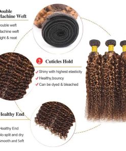 1. Material de los Paquetes de Cabello: Paquetes de Cabello Ondulado Rizado de Color P4/30, Cabello Humano Brasileño de Grado 8A, Saludable y Fuerte, Suave y Sedoso.