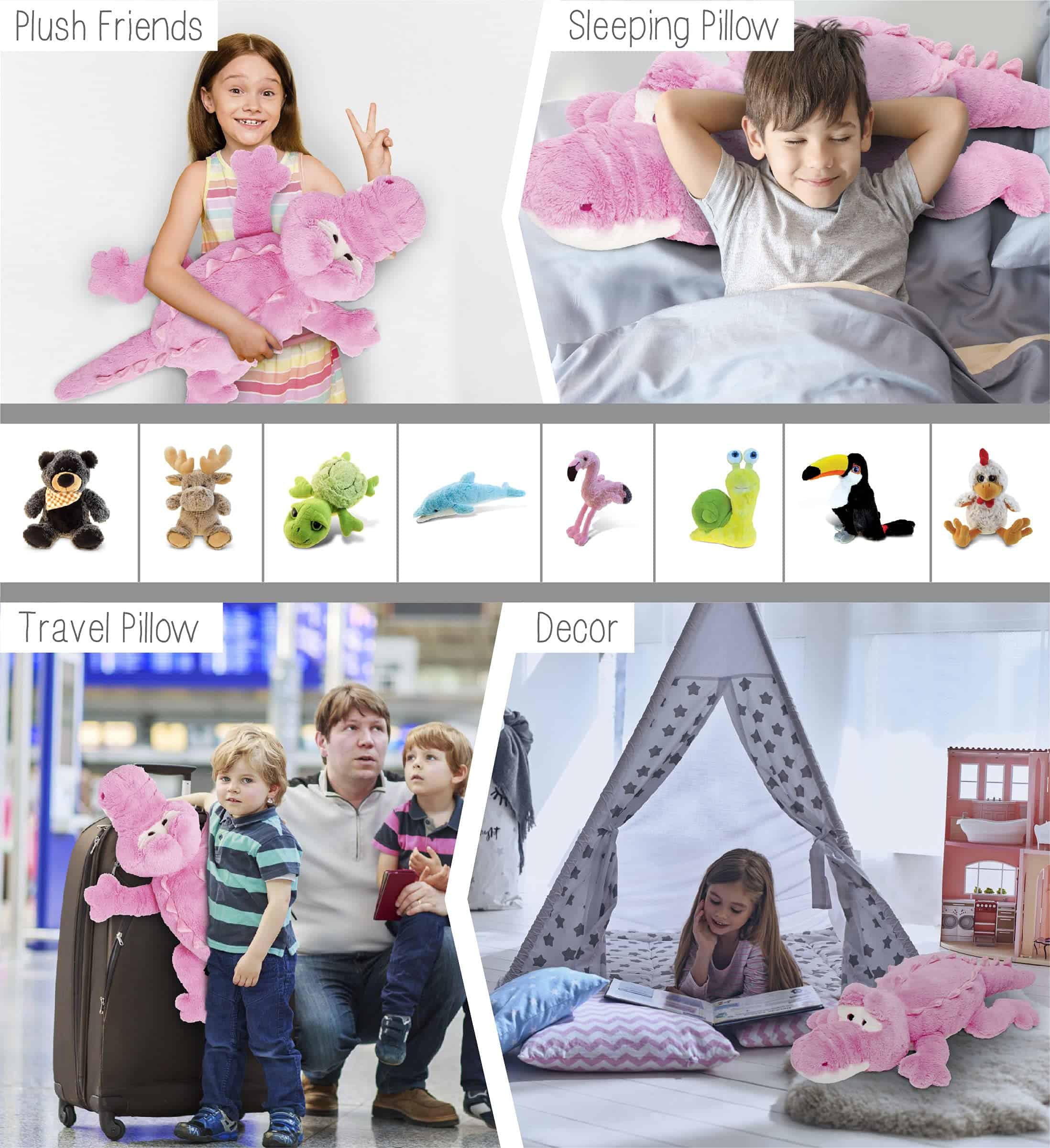 1. LA ALMOHADA DE PELUCHE DE COCODRILO VIENE CON UN DISEÑO ÚNICO QUE TE ENCANTARÁ Haz que el tiempo de juego de tu pequeño sea más divertido y emocionante sorprendiéndolo con un peluche gigante! La Almohada de Peluche de Cocodrilo DolliBu es un juguete animal abrazable que hará que tus hijos disfruten de un juego imaginario con animales salvajes. Juguete perfecto para que los niños jueguen en el suelo y abracen cuando duerman. Un peluche imprescindible que proporcionará mayor comodidad a tus niños juguetones. n2. LA GRAN ALMOHADA DE SIESTA ES PARA TODOS LOS QUE AMAN LOS ANIMALES Y LOS PELUCHES A todos les gustaría una almohada gigante para siestas, comodidad y juego. Sorprende a tu familia y amigos con un lindo regalo de peluche gigante. Los niños pequeños pueden recostarse cómodamente en el gran cocodrilo y disfrutar del tiempo de juego mientras que los adultos pueden tener una siesta cómoda en cualquier lugar utilizando el juguete relleno de cocodrilo como su almohada. Peluche perfecto para los amantes de los animales salvajes y coleccionistas de peluches. n3. INCLUIDO CON LA COMPRA DE PEQUEÑO PELUCHE DE ALMOHADA – Incluye 1 Almohada de Peluche de Cocodrilo Grande DolliBu que presenta un lindo juguete animal salvaje en posición de acostado. El peluche esponjoso de cocodrilo con ojos rosados brillantes presenta capas suaves de espinas en el cuerpo del cocodrilo y tiene una linda cola y 4 patas suaves. La cabeza redonda está bordada con características animales realistas. La almohada de peluche grande mide aproximadamente 34 pulgadas de largo, tamaño perfecto para abrazos. n4. JUGUETE DE PELUCHE CÓMODO DE ALTA CALIDAD PARA SIESTAS La almohada acogedora está hecha de 100% poliéster nuevo de primera calidad, rellena con rellenos de poliéster. Cosida a mano con tela de piel sintética rosa suave que agrega suavidad al juguete. La almohada de peluche suave es un juguete de peluche grande y duradero, diseñado para proporcionar comodidad cuando se utiliza como cojín para el suelo o almohada de abrazo. Para mantener la adorable almohada de cocodrilo grande, limpie la superficie con agua fría y deje secar al aire. n5. USO IDEAL PARA EL JUGUETE DE ALMOHADA GRANDE DE COCODRILO – Almohada de animal grande para un juego imaginario divertido, un compañero perfecto para abrazos durante la hora de dormir, siesta del mediodía, pijamadas y cojín diario. Agrega almohadas de peluche grandes como decoración de habitaciones que los niños pueden usar como cojín para el suelo o acolchado en superficies duras para un juego más cómodo. Los animales de peluche grandes y adorables también se pueden usar como accesorios fotográficos para niños. Organiza una divertida fiesta de pijamas usando la linda almohada de cocodrilo de peluche.