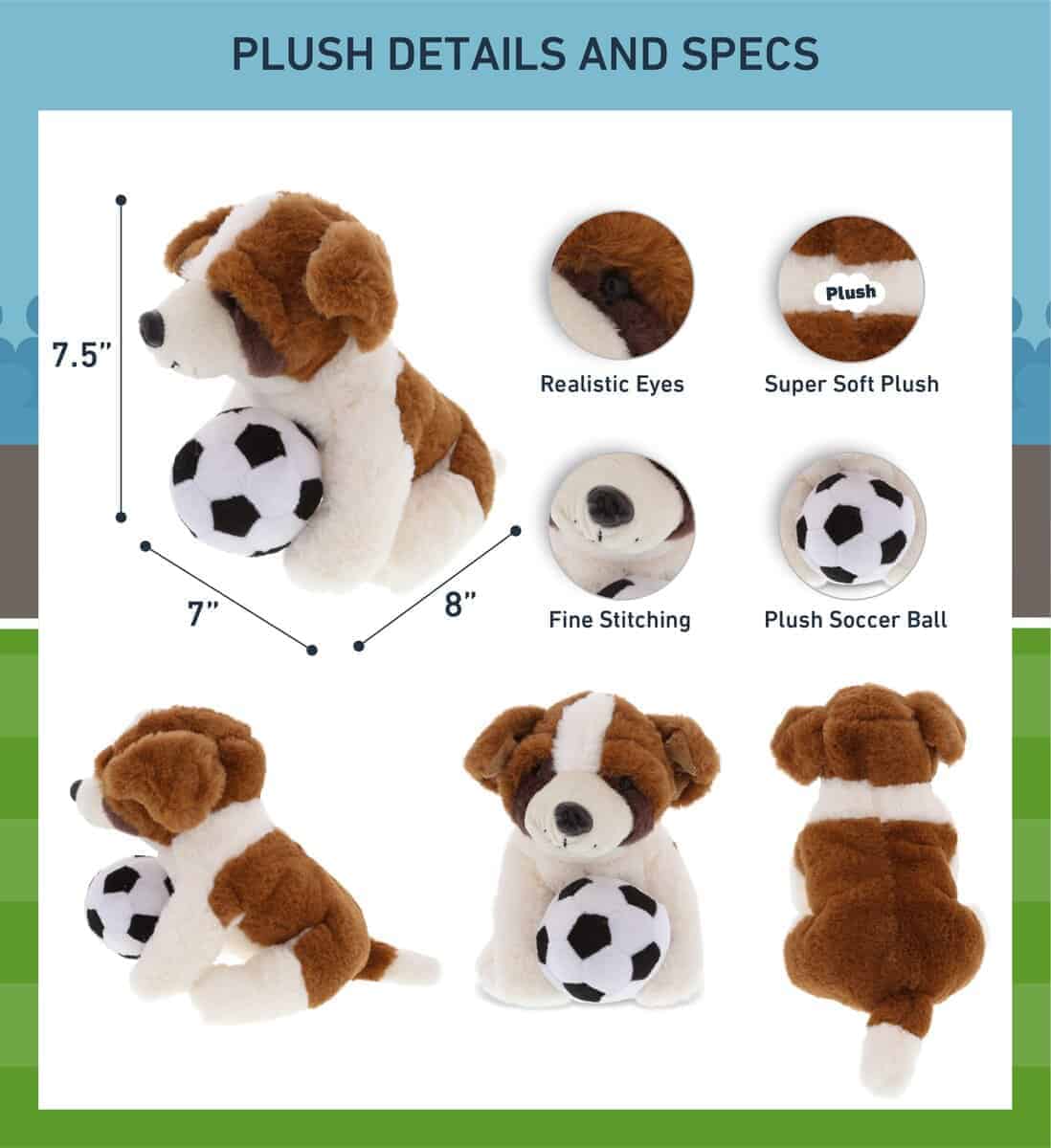 El peluche de perro San Bernardo de DolliBu con la pelota de fútbol de peluche es un juguete de peluche seguro para niños y niños pequeños de todas las edades. El lindo animal de peluche seguramente hará sonreír a tus seres queridos que aman los animales de mascota, especialmente los perros. El perro será una gran adición a la colección de peluches de un niño mientras que las parejas pueden expresar su amor sorprendiendo a su mejor mitad con un peluche único. Los peluches ayudan a desarrollar habilidades sociales, habla y creatividad cuando disfrutan de un tiempo de juego imaginativo con su familia. El peluche San Bernardo será el mejor amigo de peluche abrazable de tu pequeño cuando juegue, viaje y aprenda. Cualquiera amará recibir lindos peluches como juguetes de perro. Niños y niñas de todas las edades aman abrazarse con un juguete de peluche esponjoso. Los peluches suaves son regalos clásicos para seres queridos. También hace un dulce regalo para tu pareja en ocasiones como cumpleaños, Día de San Valentín y Navidad. Envía tu amor a niños enfermos y adultos dándoles un lindo peluche de perro San Bernardo como regalos para mejorar su estado de salud. Incluye 1 DolliBu Perrito San Bernardo de Peluche Super Suave con una pelota de fútbol de peluche, decorada con características realistas de un lindo bebé de peluche. El cuerpo del perro con una pelota de fútbol de regalo deportivo lo convierte en un peluche perfecto para abrazos. El juguete de peluche de perro tiene detalles como sus orejas y hocico característicos. Los ojos del perro hacen que el animal sea tan encantador. El tierno amigo de peluche de perro mide 8Lx7Wx7.5H pulgadas.