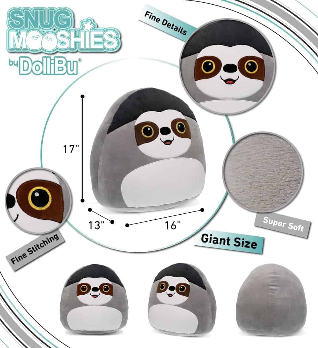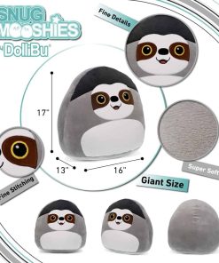 Con la compra de este lindo peluche, recibirás un DolliBu Snug Mooshies Sloth Super Squishy Stuffed Animal grande. Este peluche blanco, gris y negro cuenta con antifaces de ojos marrones bordados para un toque único. Ya sea un peluche para niños o un animal de peluche para adultos, el sloth de Snug Mooshies es la opción perfecta. Sus dimensiones de 16Lx13Wx17H pulgadas lo convierten en un compañero grande y esponjoso.