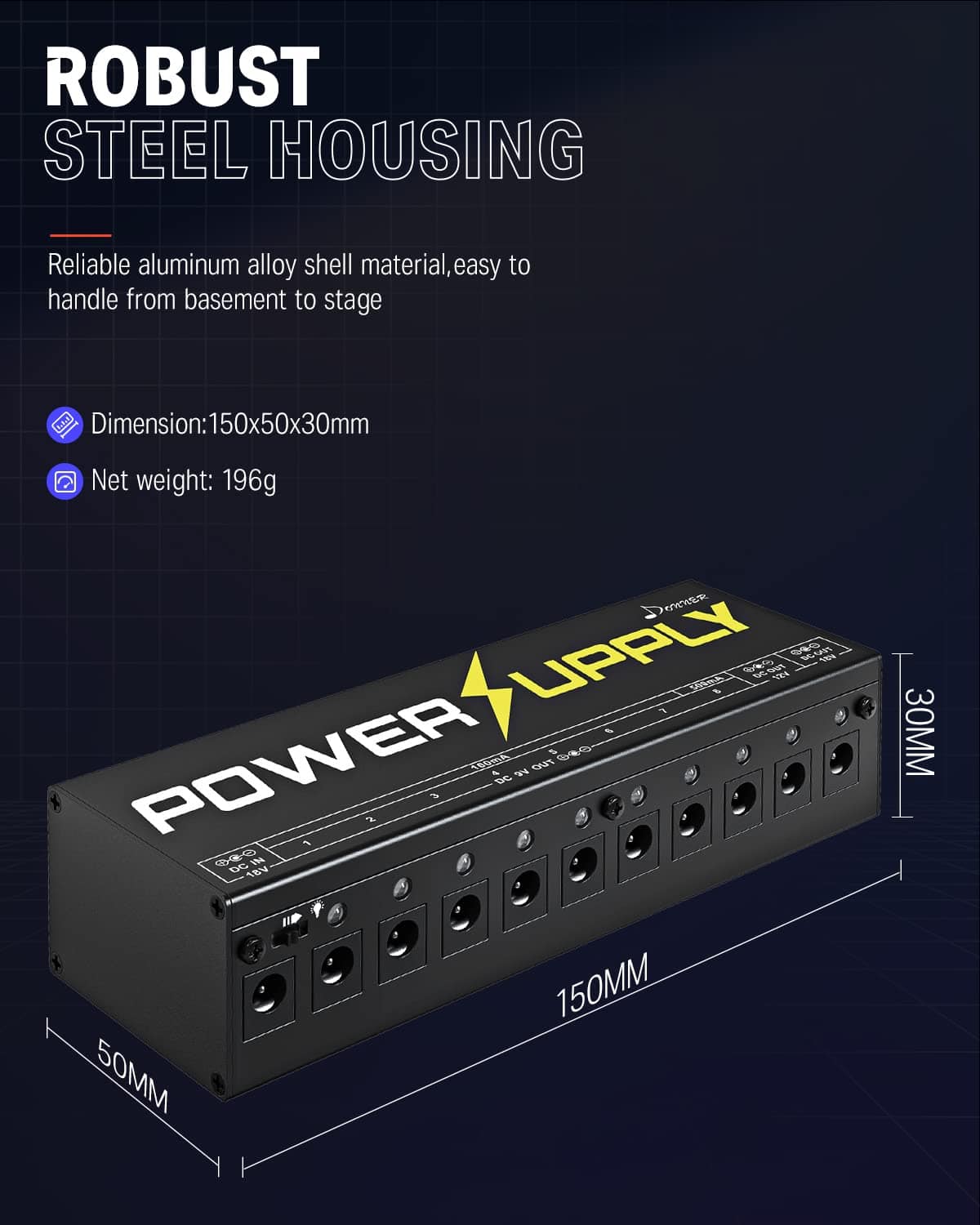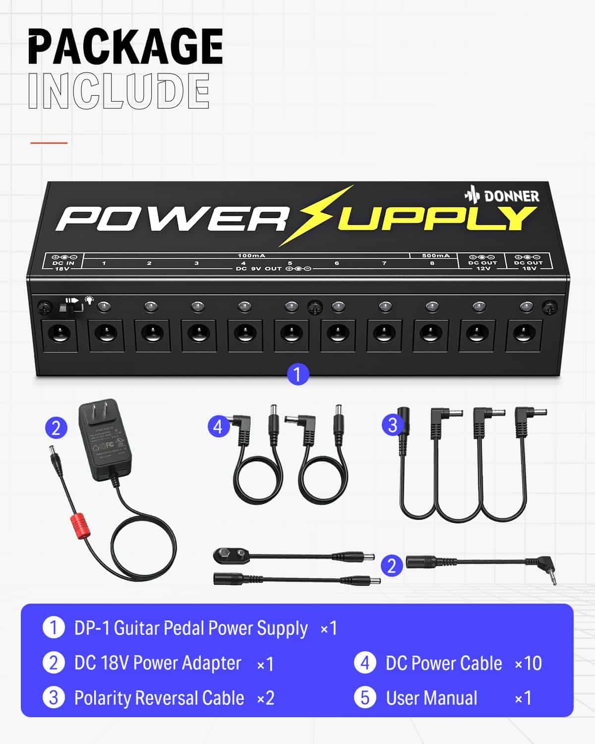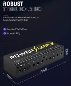 Especificaciones: Material: aleación de aluminio, ligero y portátil. Potencia: AC 100-240V. Entrada: DC 18V. Salida: 7 salidas de 9V 100mA, 1 salida de 9V 500mA, 1 salida de 12V 100mA, 1 salida de 18V 100mA. Dimensiones: 150 x 50 x 30mm. Peso neto: 196g. Color: Negro. Protección contra cortocircuitos: Todas las 10 salidas de esta unidad tienen protección contra cortocircuitos independiente, es decir, un cortocircuito en un canal no afectará la función de los otros canales. Bajo las circunstancias de que todas las luces LED estén encendidas, la luz LED del canal con cortocircuito se apagará, mientras que las luces en los otros canales normales seguirán encendidas. Esto ayuda a localizar las fallas cuando hay cortocircuitos entre muchos efectos. Atención: La polaridad incorrecta dañaría esta unidad, asegúrese de la polaridad positiva y negativa correcta antes de conectar los cables. Paquete incluido: 1 x fuente de alimentación Donner DP-1, 1 x adaptador de corriente, 10 x cable de alimentación DC, 2 x cable de inversión de polaridad, 1 x manual del usuario.