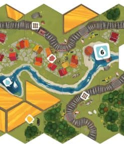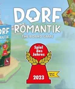 ¡Ríos burbujeantes, bosques susurrantes, campos de trigo meciéndose en el viento, y de vez en cuando un pequeño pueblo bonito, eso es Dorfromantik! La comunidad de jugadores ha estado encantada con el videojuego del pequeño estudio indie Toukana Interactive desde su acceso anticipado en marzo de 2021. Incluso ha ganado varios premios conocidos de videojuegos. Ahora Michael Palm y Lukas Zach han transformado el popular juego de construcción de paisajes en un juego de mesa familiar para todas las edades con Dorfromantik El Juego de Mesa. En Dorfromantik El Juego de Mesa, hasta seis jugadores utilizan fichas hexagonales para formar juntos un paisaje hermoso y tratan de cumplir los deseos de su población. Al mismo tiempo, deben colocar la vía del tren y el río más largo posible, y tener en cuenta las banderas, que proporcionan puntos en las áreas completadas. Cuanto mejor logren los jugadores diseñar su paisaje, más puntos podrán obtener al final de una partida. Durante la campaña rejugable, se pueden desbloquear nuevas fichas con los puntos obtenidos en partidas anteriores. Esas fichas están inicialmente ocultas en pequeñas cajas cerradas. Proporcionan a los jugadores nuevas tareas adicionales y permiten seguir aumentando la mejor puntuación en este juego cooperativo.