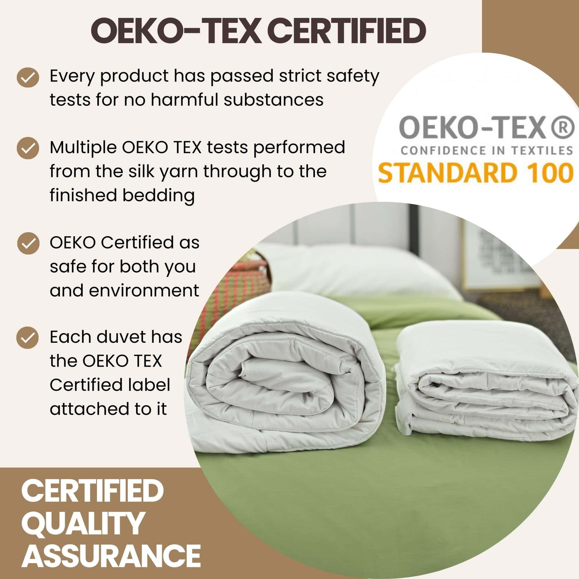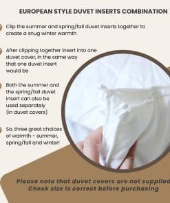 Dos insertos de edredón llenos de seda de morera/microfibra mezclada. Combo de verano y primavera/otoño. Único sistema de «Easy-Clip» que crea un edredón cálido y ajustado para el invierno también. Tres opciones de calidez de edredón utilizando solo 2 edredones: verano, primavera/otoño e invierno. De la colección de la marca británica de calidad ‘Silk Bedding Direct’, con sede en Londres, Inglaterra desde 2012, disponible en Estados Unidos desde 2018. Disfruta de limpieza y comodidad todas las noches con nuestros insertos de edredón de seda de morera de alta calidad mezclada con microfibra de seda sintética. Un abrazo nocturno meticulosamente diseñado para tu comodidad. Creado con una funda de satén de algodón de la más alta calidad que permite que todas las propiedades de la seda de morera se filtren, un lujo duradero que te envuelve noche tras noche. Sumérgete en la bondad sin igual de la seda, en la elegancia del edredón de estilo europeo (se usa con una funda de edredón – no suministrada). Embárcate en un viaje de salud y belleza holístico. Experimenta la cúspide de la limpieza e higiene y disfruta de las maravillas antienvejecimiento de la seda de morera pura. Enriquecida con la proteína natural sericina y aminoácidos, la seda de morera en esta ropa de cama mima tu piel y nutre y protege tu cabello. Recomendado para asma, alergias y eczema también, es más que una simple ropa de cama, es un santuario de bienestar y belleza. Cada edredón es una obra maestra, completo con una cremallera de inspección discreta, donde puedes ver y sentir el suave interior de seda. El mantenimiento es sencillo, simplemente lavar a máquina a baja temperatura. Utiliza un detergente suave para limpiar las manchas. Disfruta de la frescura de una cama limpia y convierte la hora de dormir en un ritual diario rejuvenecedor. Todos los Edredones están Verificados con el Estándar OEKO-TEX 100 y están Completos con la Etiqueta de Calidad OEKO «Confianza en Textiles». Garantía de Devolución Total del Dinero. Devolución por Cualquier Motivo. Disfruta de la comodidad con total confianza. Asegura tus Insertos de Edredón ahora y recibe un estuche de alta calidad para llevar y almacenar como nuestros extras especiales para ti.